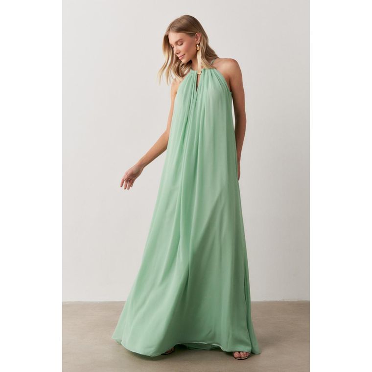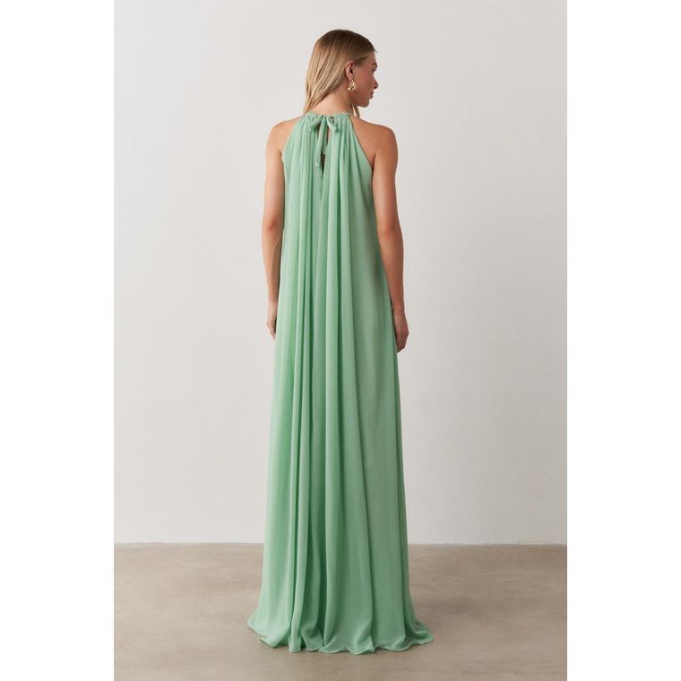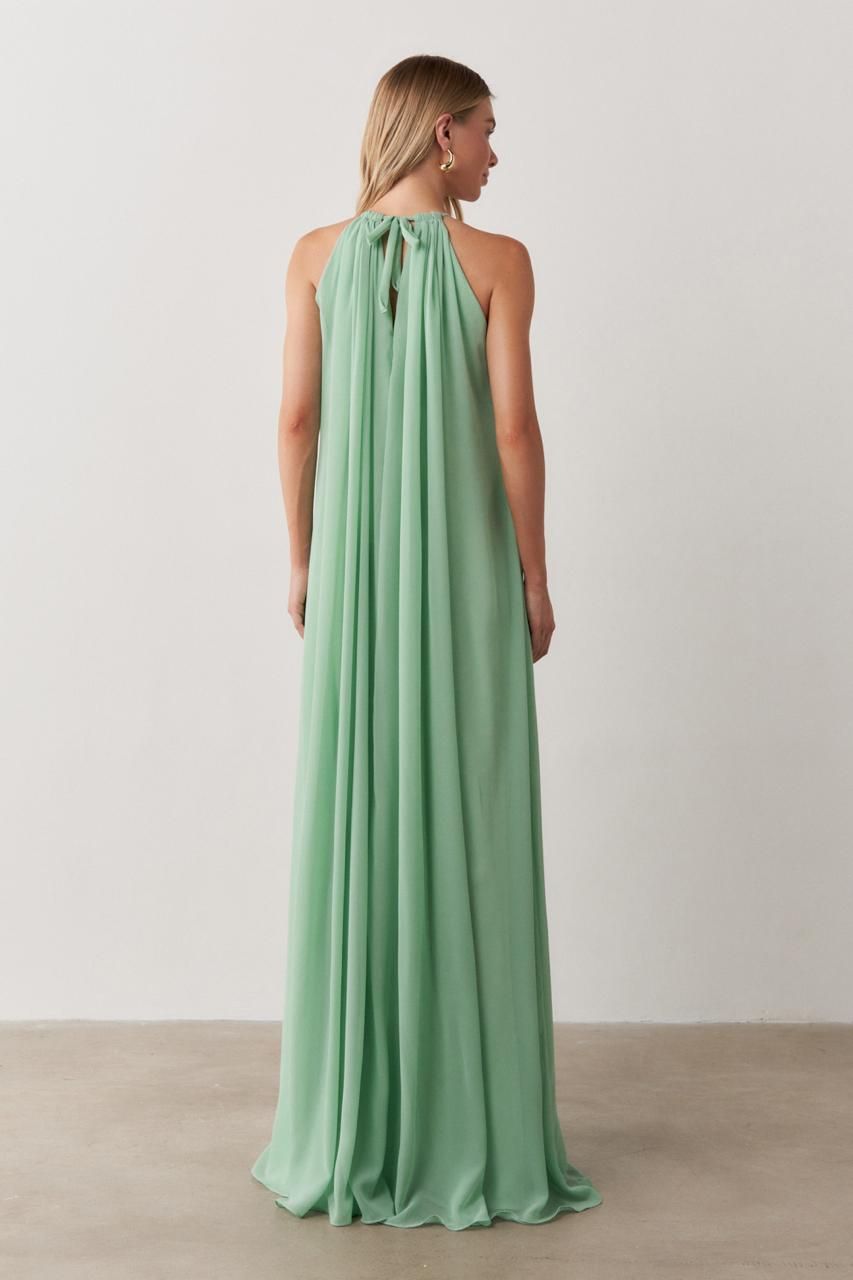 Vestido Adélia — modelo halter com decote frente única e caimento amplo em tecido leve e fluido. Minimalista e elegante, ideal para casamentos ao ar livre, formaturas e eventos sofisticados.