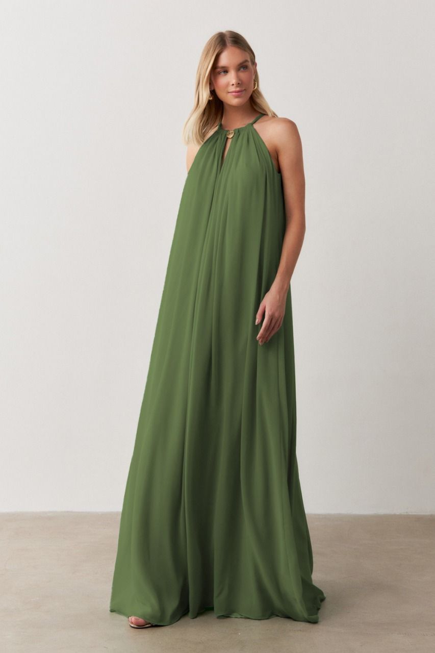 Vestido Adélia — modelo halter com decote frente única e caimento amplo em tecido leve e fluido. Minimalista e elegante, ideal para casamentos ao ar livre, formaturas e eventos sofisticados.