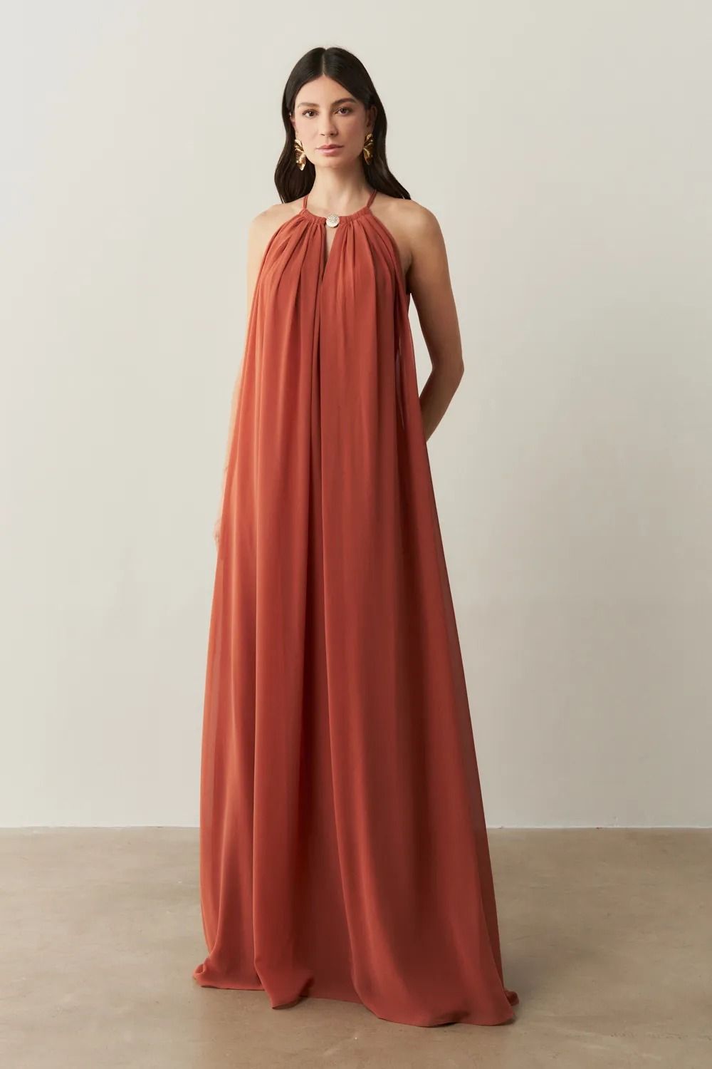 Vestido Adélia — modelo halter com decote frente única e caimento amplo em tecido leve e fluido. Minimalista e elegante, ideal para casamentos ao ar livre, formaturas e eventos sofisticados.