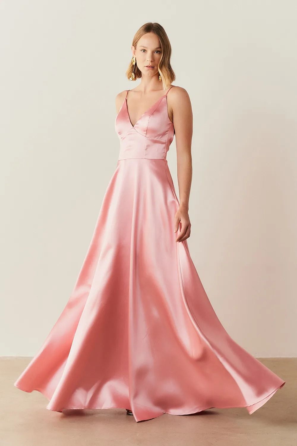 Vestido Anna — modelo de alças finas com decote em “V” e saia ampla em tecido estruturado. Clássico e atemporal, ideal para casamentos, formaturas e eventos sofisticados.
