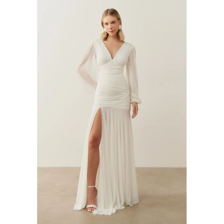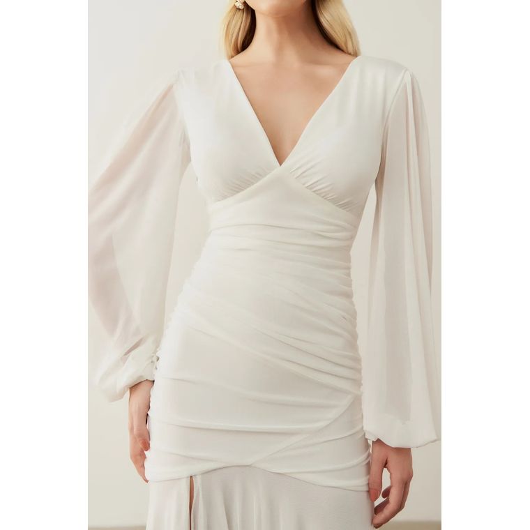 • Detalhes Importantes: Drapeado na cintura, mangas longas transparentes e saia fluida