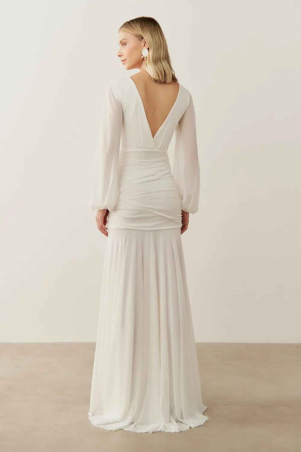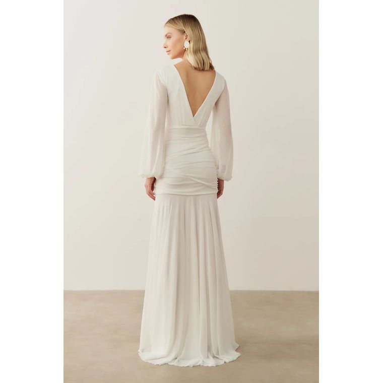 Com decote em "V" profundo na frente e nas costas, o modelo valoriza o colo e as costas com delicadeza, enquanto o drapeado na cintura cria um efeito alongado e realça a silhueta de forma sutil e elegante.