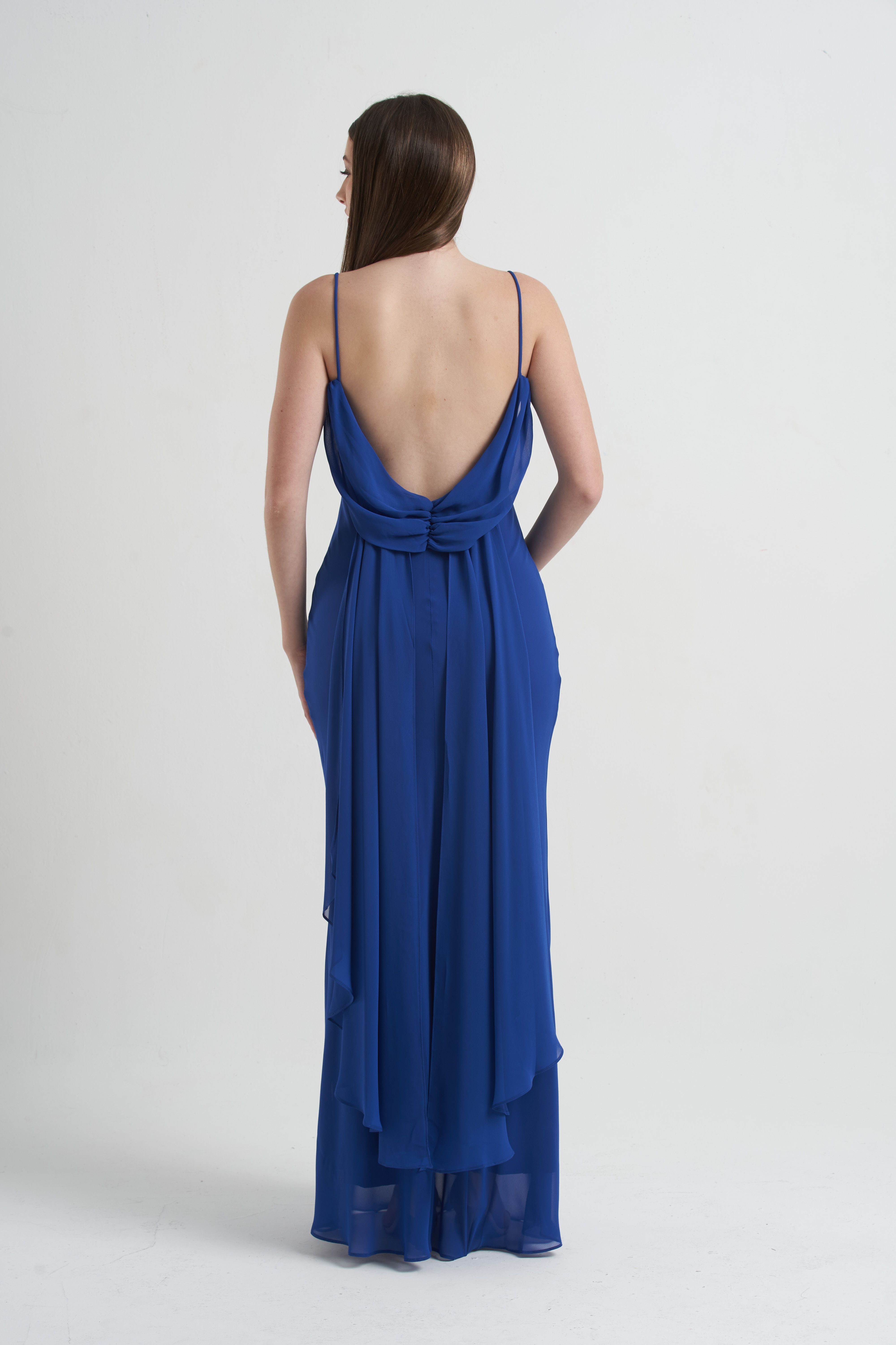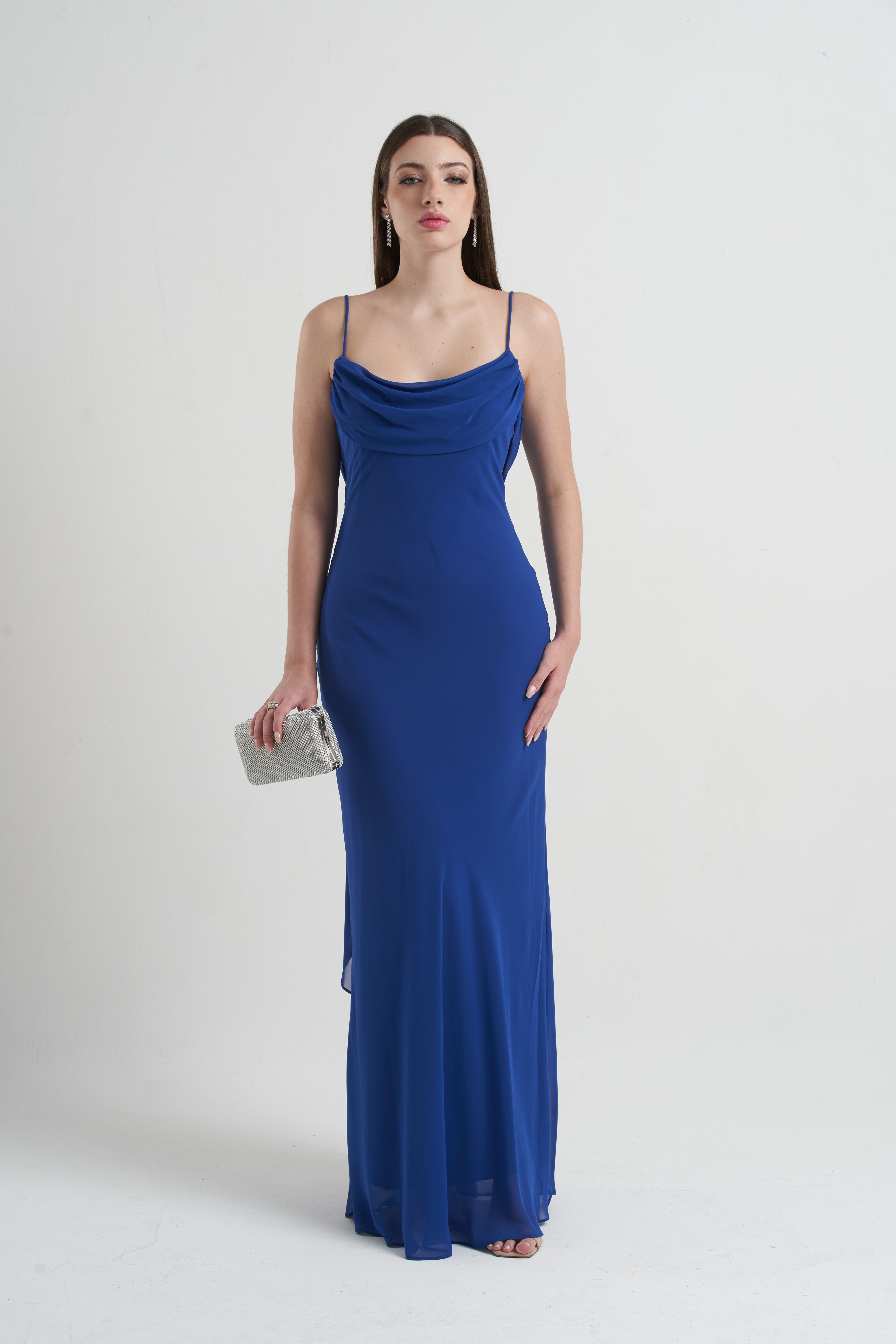 Vestido Bobo — com alcinhas finas e decote drapeado, traz leveza e fluidez ao visual. Um modelo elegante e minimalista, ideal para eventos sofisticados e celebrações especiais.