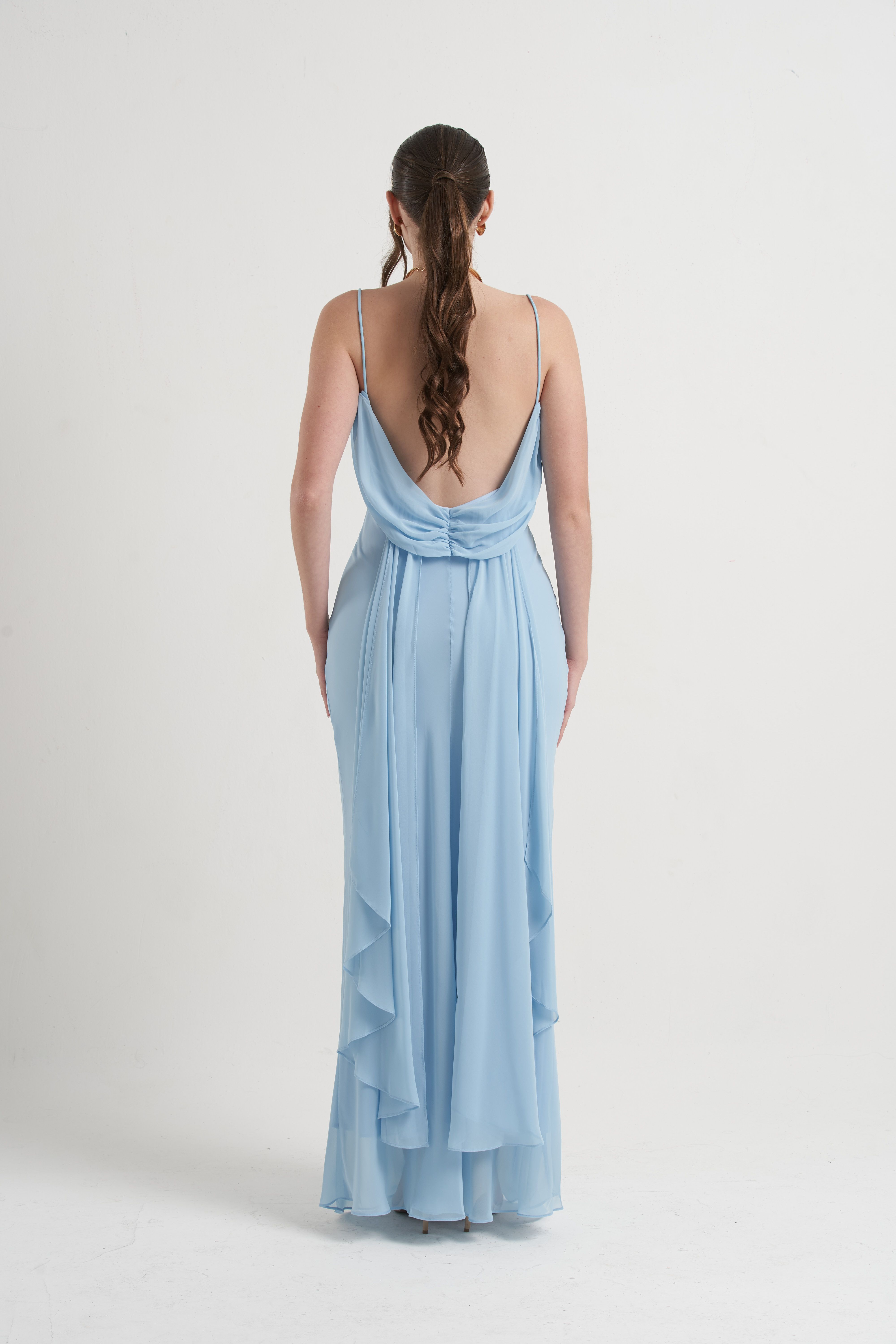 Vestido Bobo — com alcinhas finas e decote drapeado, traz leveza e fluidez ao visual. Um modelo elegante e minimalista, ideal para eventos sofisticados e celebrações especiais.