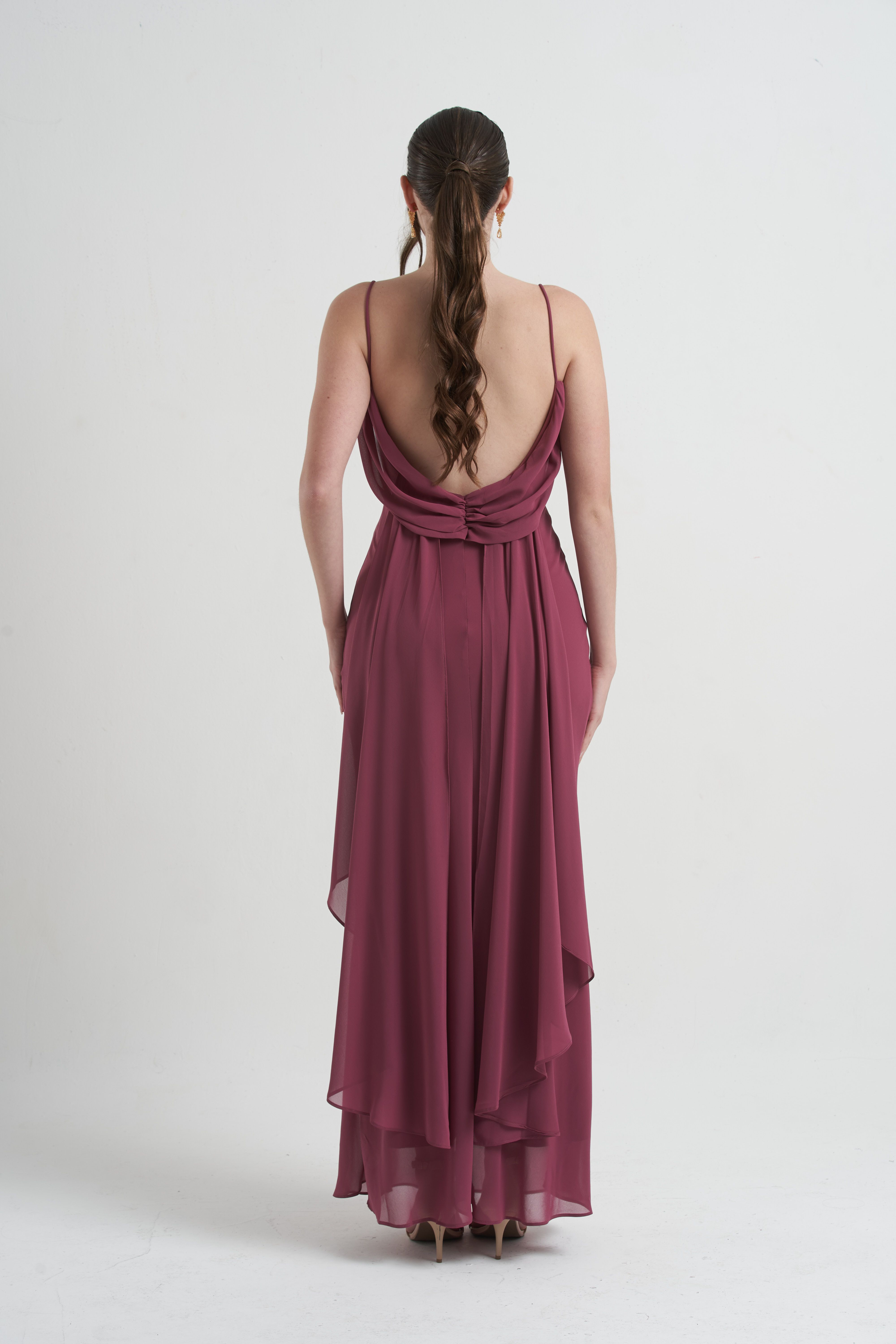 Vestido Bobo — com alcinhas finas e decote drapeado, traz leveza e fluidez ao visual. Um modelo elegante e minimalista, ideal para eventos sofisticados e celebrações especiais.
