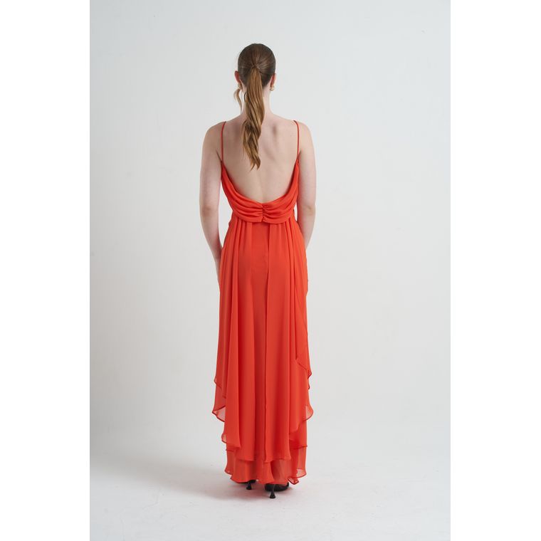 • Decote em U nas costas com prolongamento em cauda de tecido