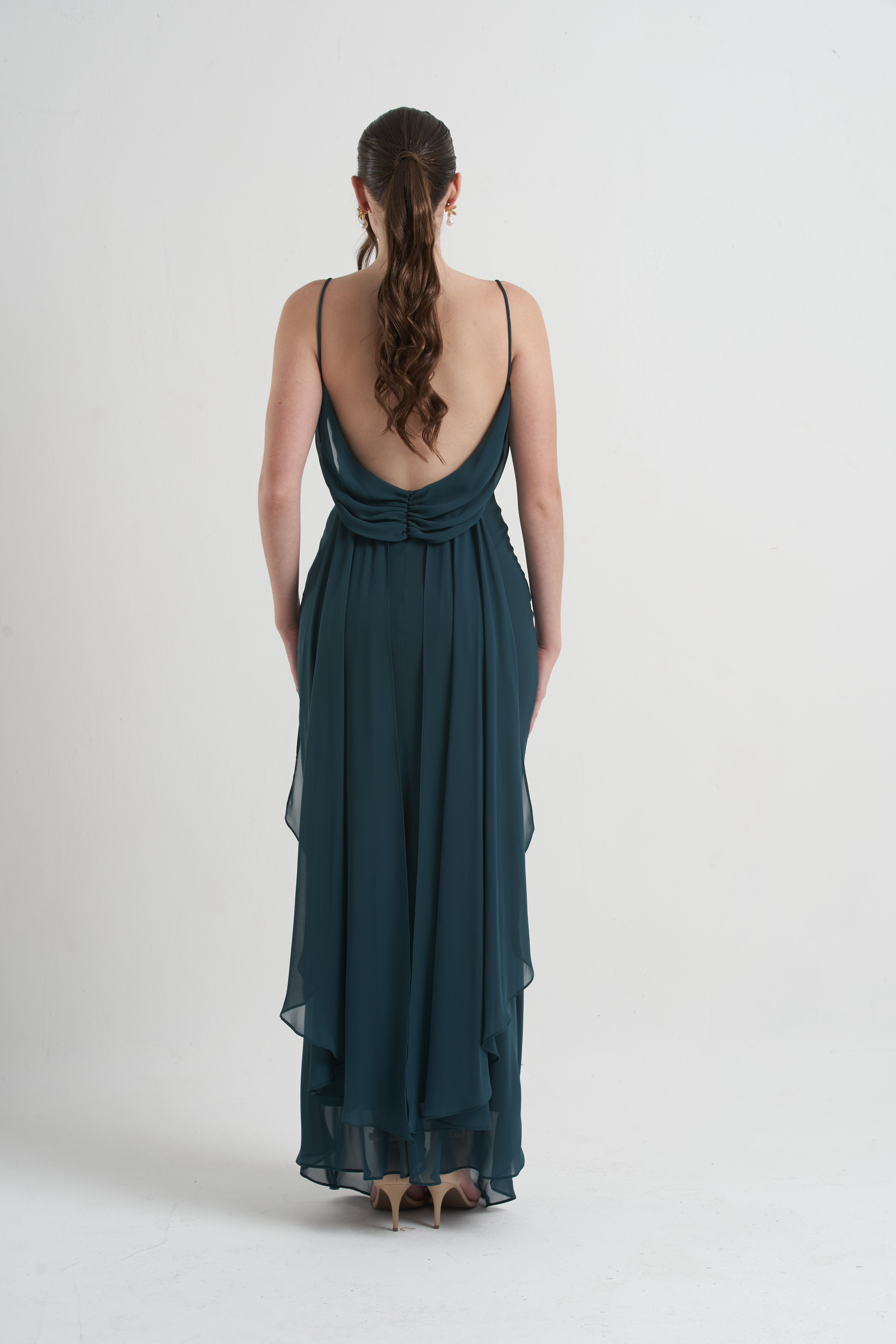 Vestido Bobo — com alcinhas finas e decote drapeado, traz leveza e fluidez ao visual. Um modelo elegante e minimalista, ideal para eventos sofisticados e celebrações especiais.