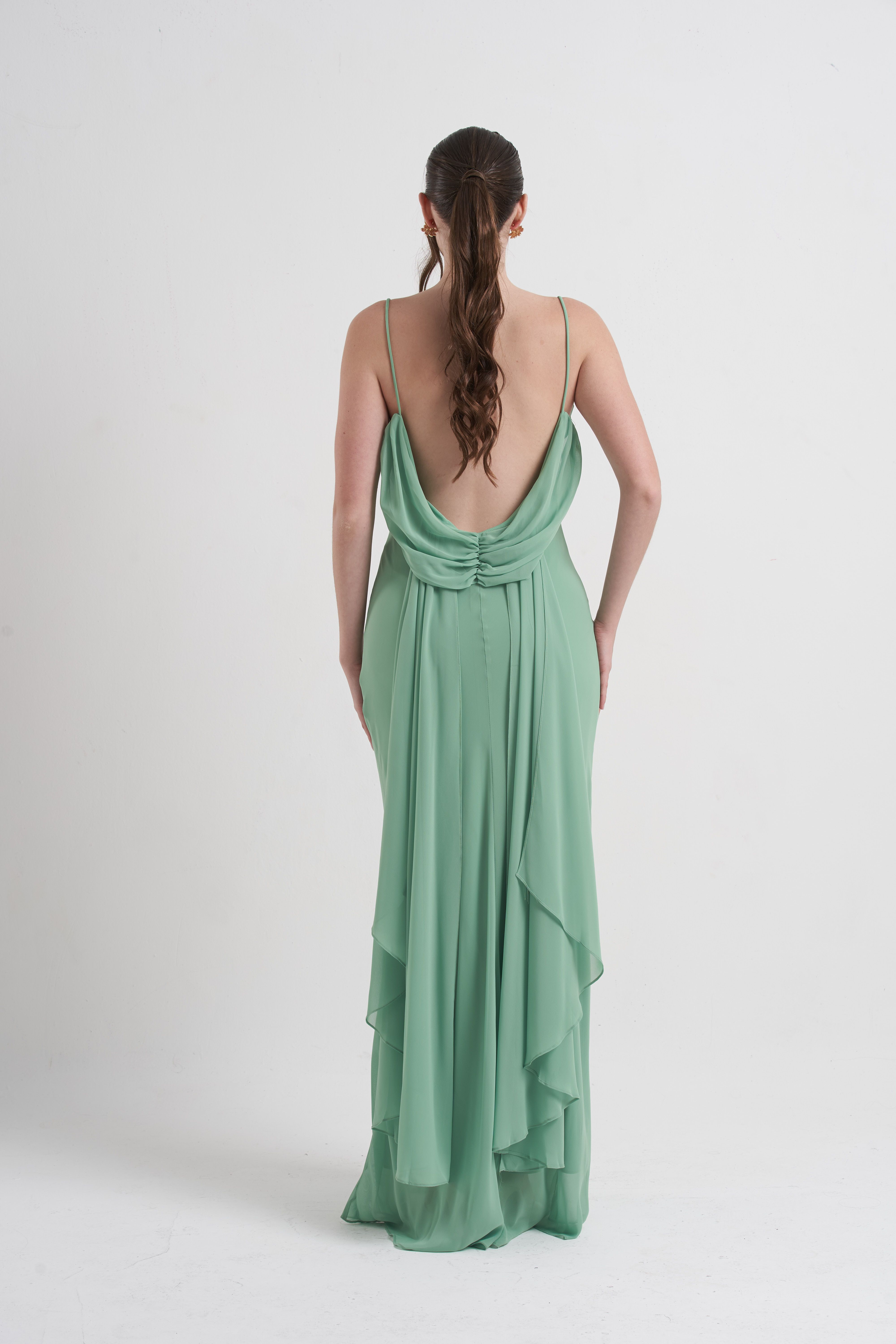Vestido Bobo — com alcinhas finas e decote drapeado, traz leveza e fluidez ao visual. Um modelo elegante e minimalista, ideal para eventos sofisticados e celebrações especiais.