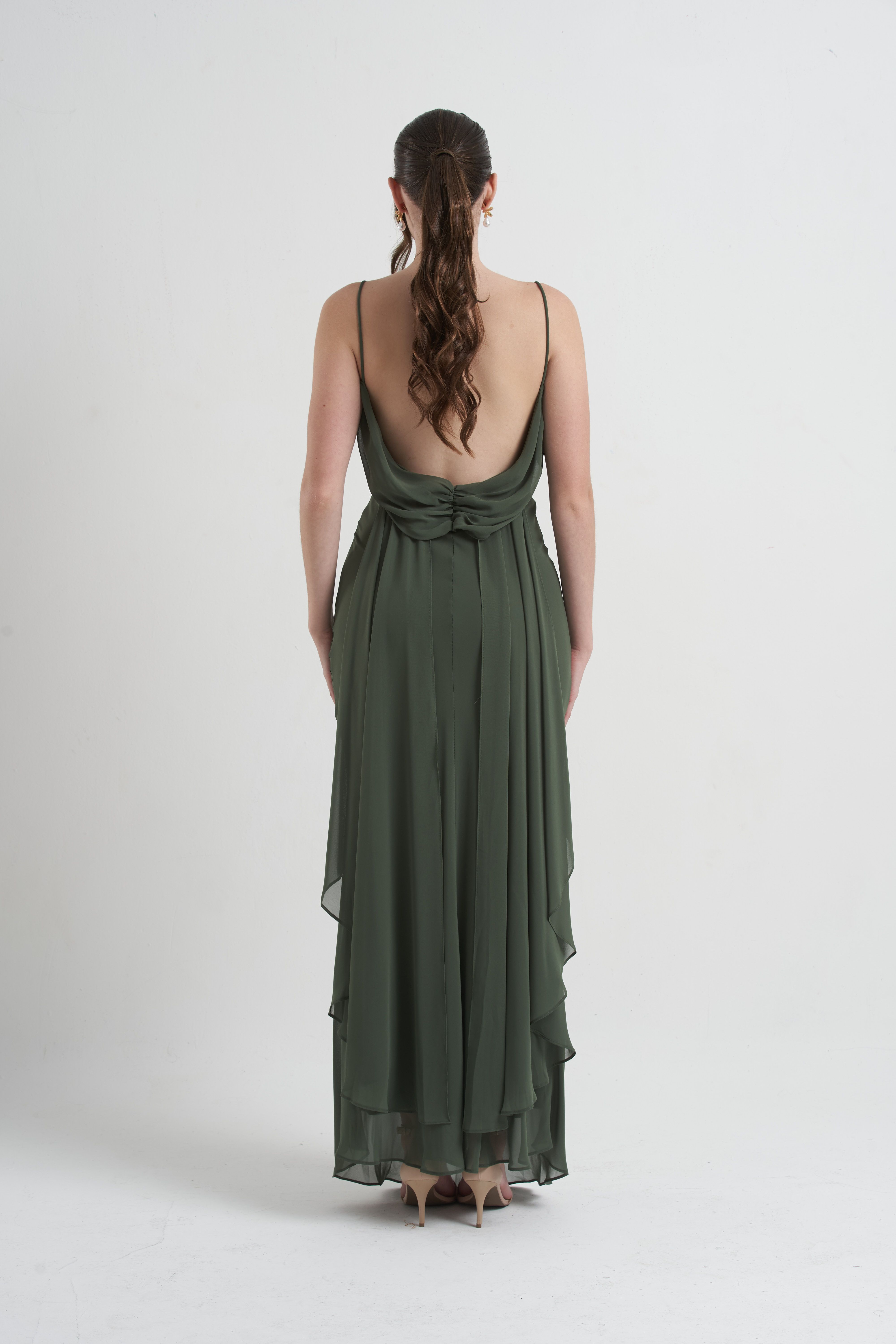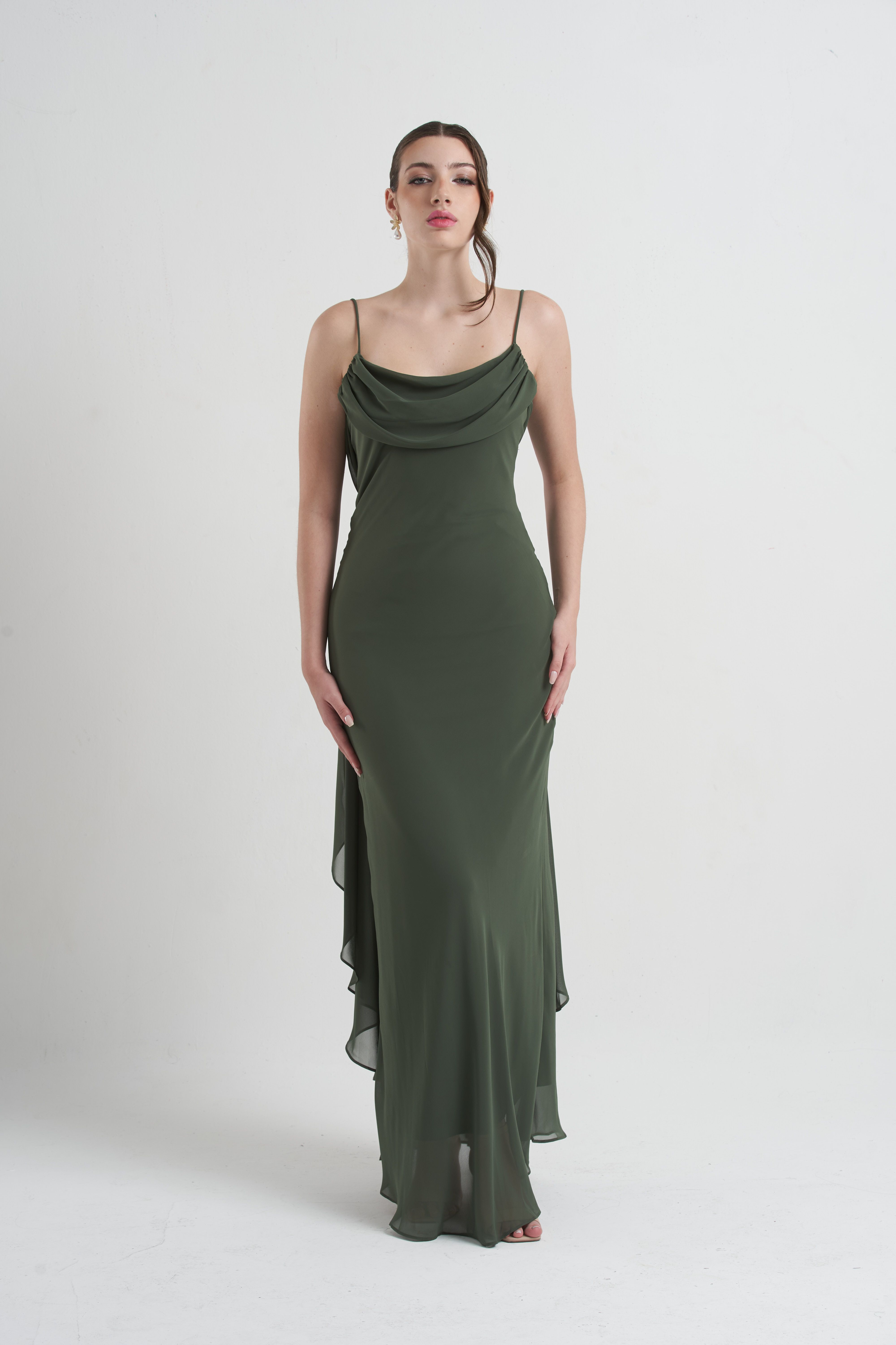 Vestido Bobo — com alcinhas finas e decote drapeado, traz leveza e fluidez ao visual. Um modelo elegante e minimalista, ideal para eventos sofisticados e celebrações especiais.