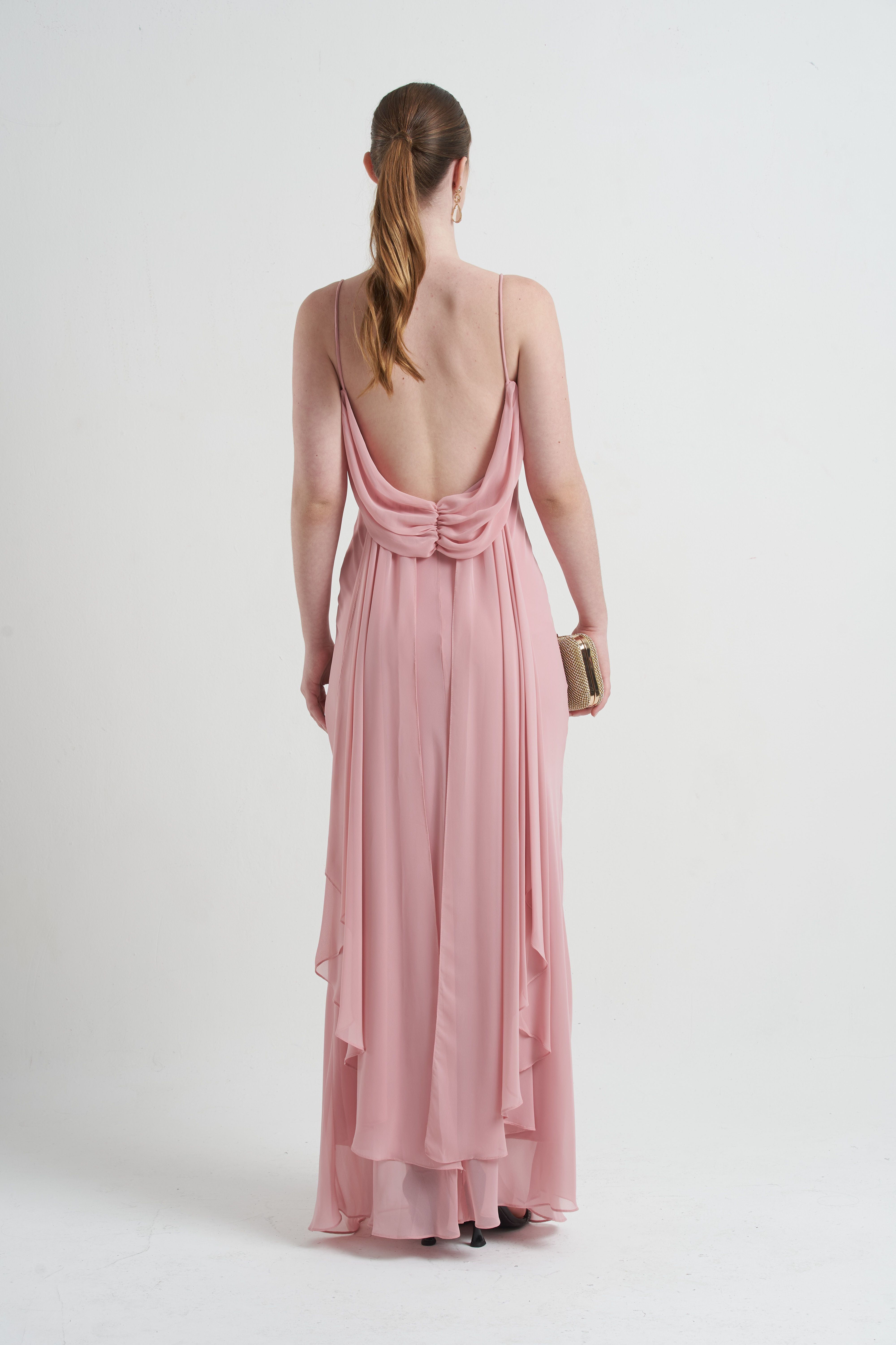 Vestido Bobo — com alcinhas finas e decote drapeado, traz leveza e fluidez ao visual. Um modelo elegante e minimalista, ideal para eventos sofisticados e celebrações especiais.