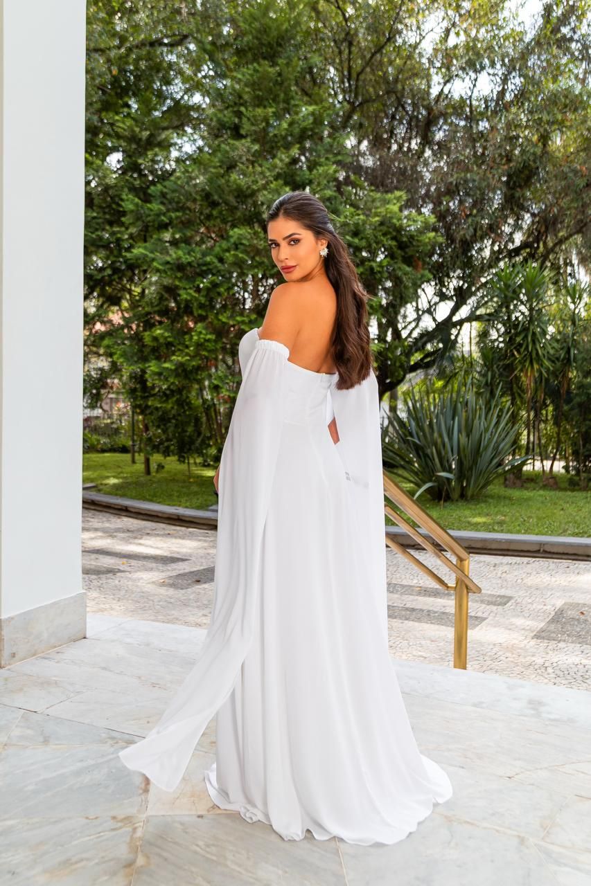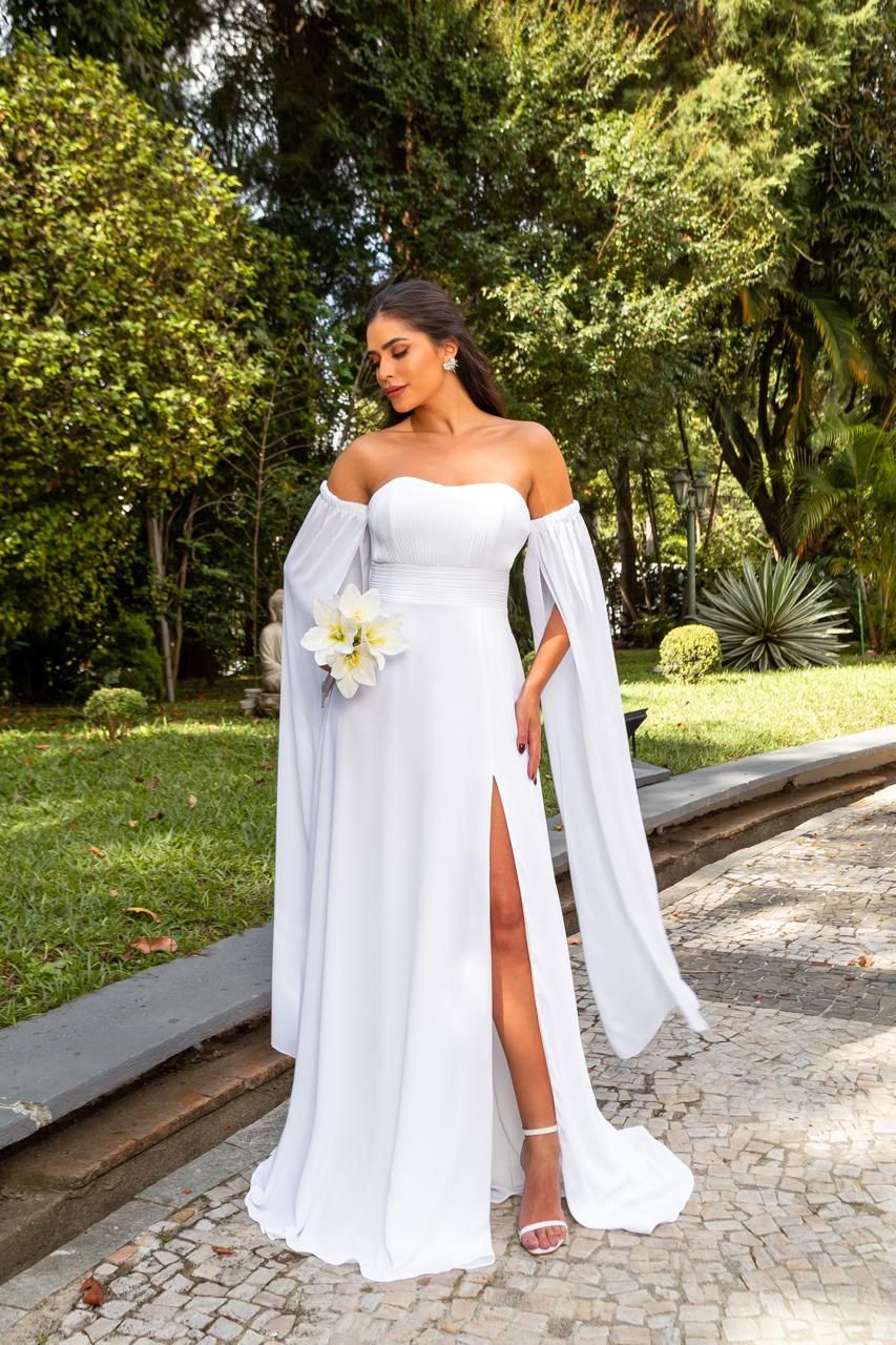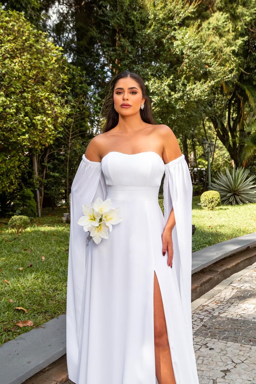 Vestido Florença — modelo ombro a ombro com mangas amplas e fenda elegante. Ideal para noivas modernas, casamentos civis e cerimônias ao ar livre.