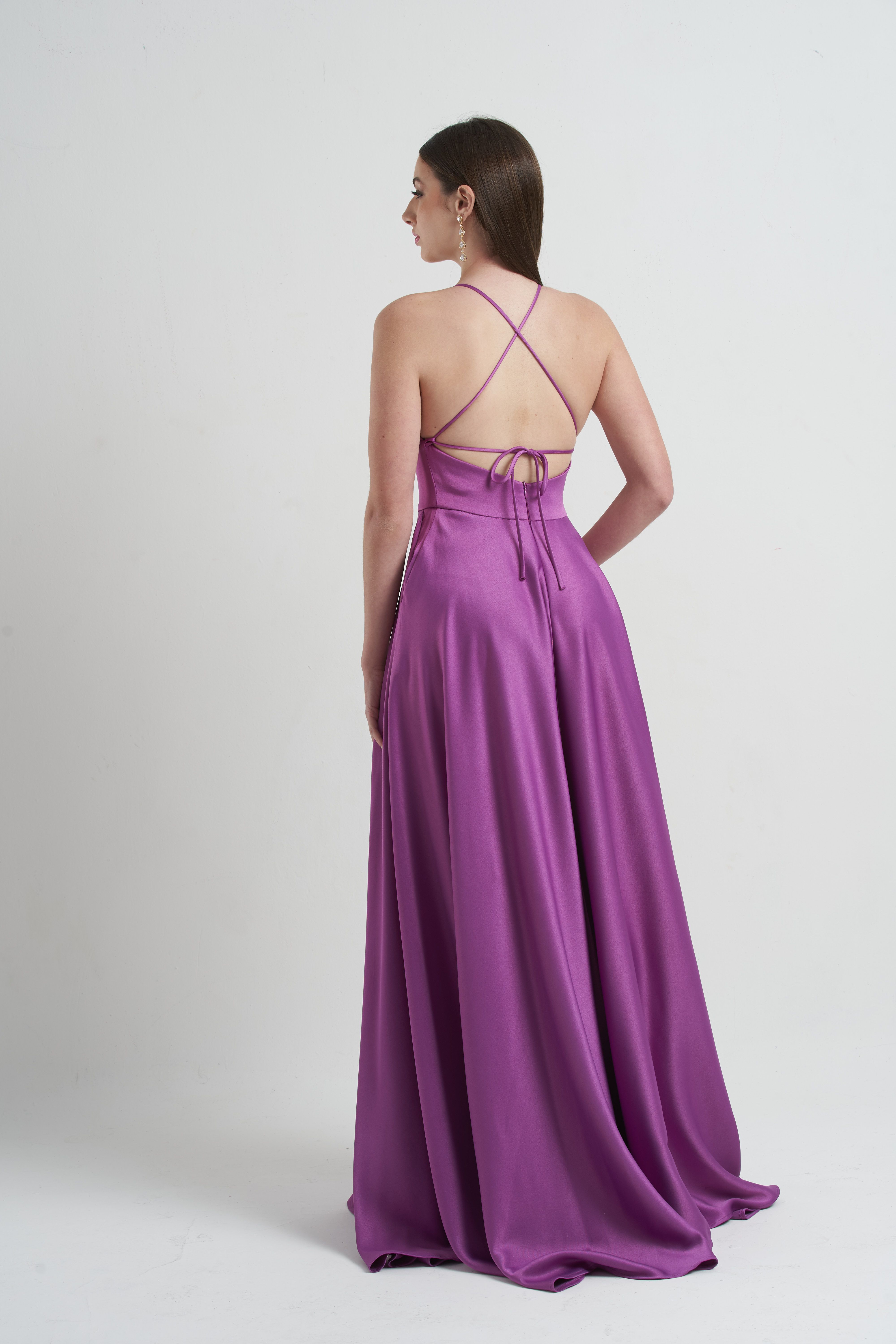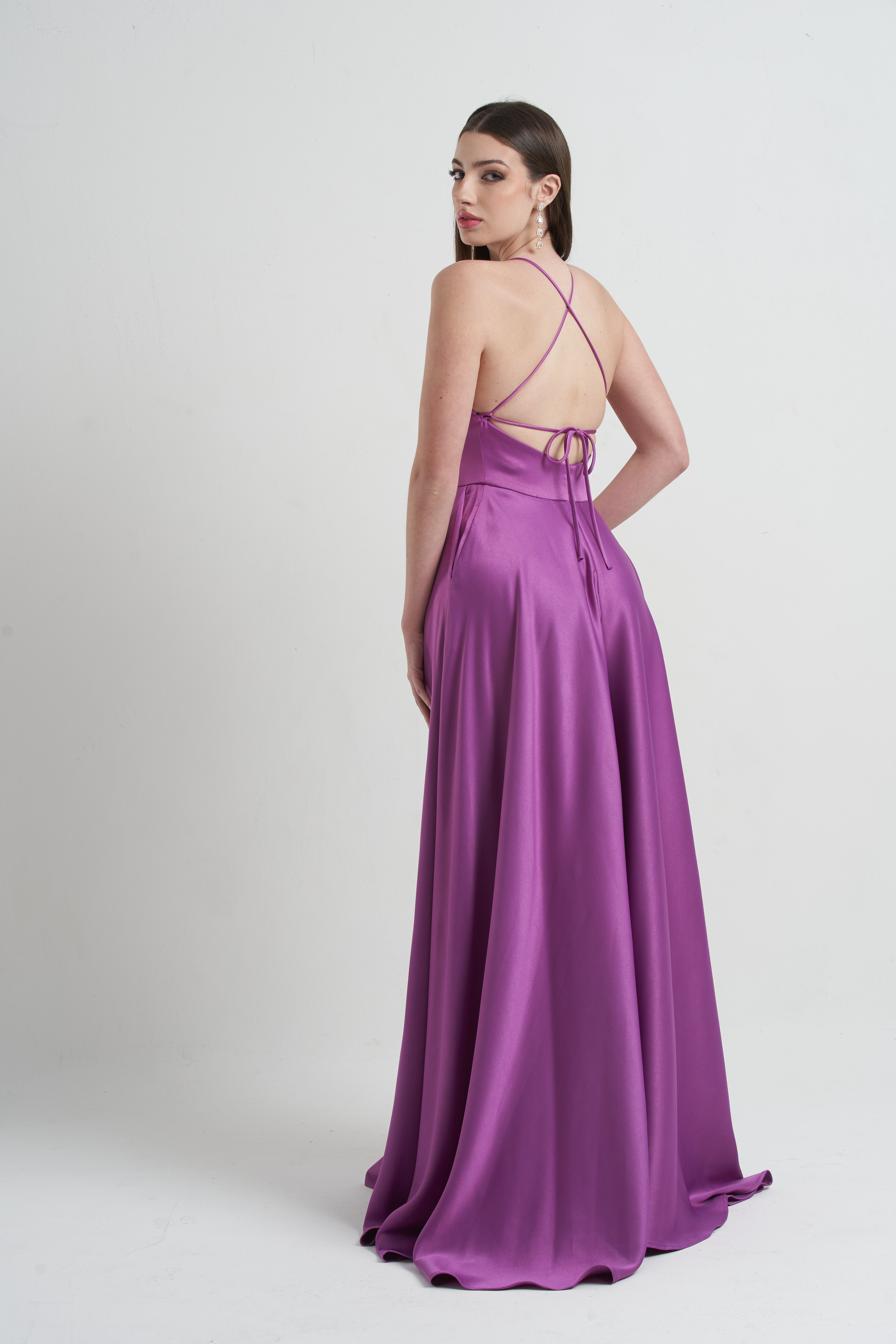 Vestido Cetim Com pala — feito inteiramente em cetim, com saia ampla estilo princesa, bolso e decote em “V”. Um modelo imponente e sofisticado, perfeito para quem busca elegância clássica.