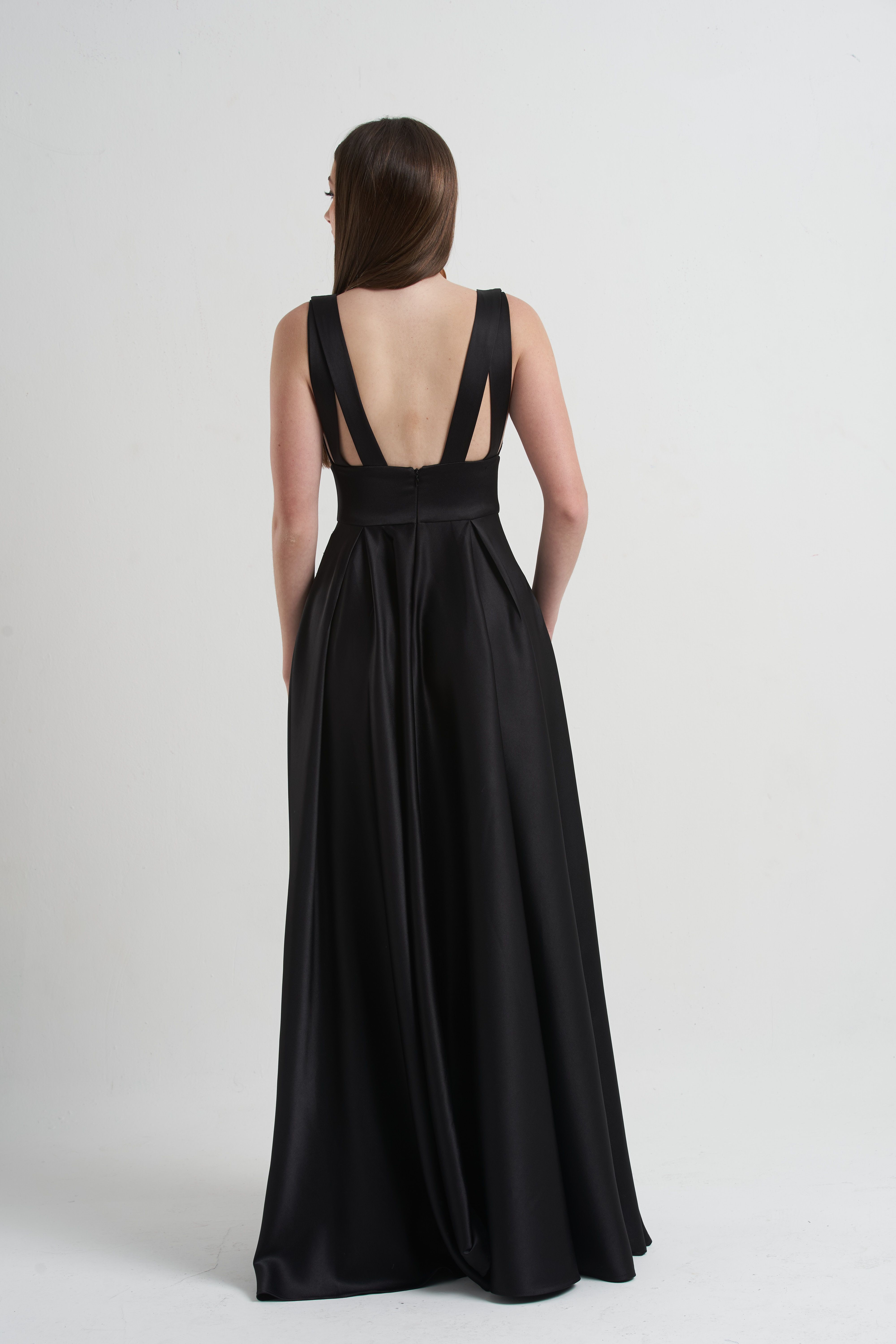 Vestido Cetim Com pala — feito inteiramente em cetim, com saia ampla estilo princesa, bolso e decote em “V”. Um modelo imponente e sofisticado, perfeito para quem busca elegância clássica.