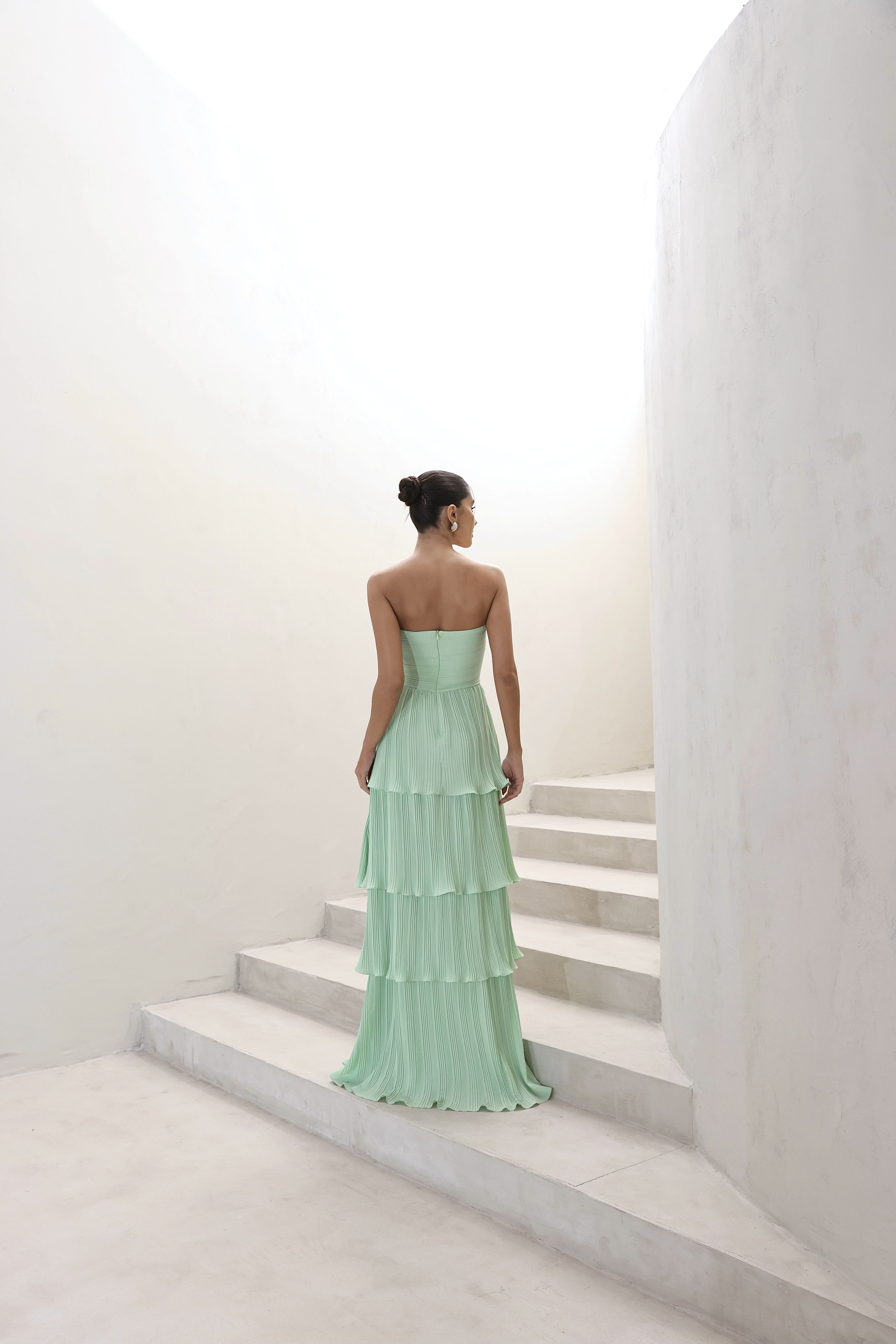 A saia em camadas sobrepostas cria um caimento encantador e um movimento suave a cada passo, conferindo elegância e romantismo à peça. O tecido plissado reforça a sensação de leveza e textura, dando um toque moderno e refinado ao look.