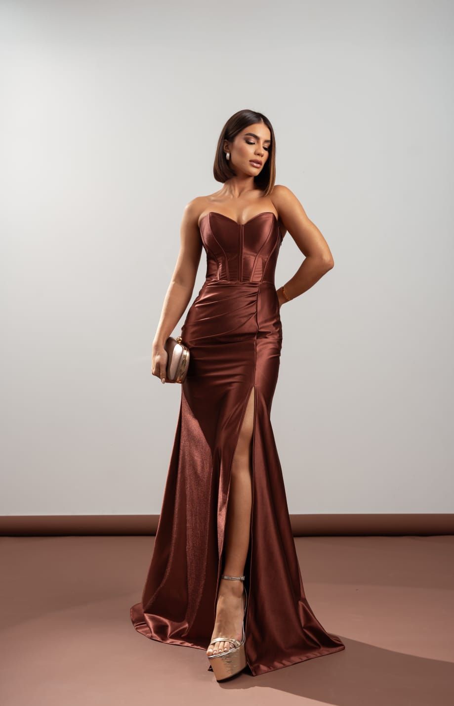 Vestido Joy — modelo tomara que caia com corset estruturado e fenda frontal. Ajustado ao corpo e confeccionado em tecido acetinado, une elegância e sensualidade. Ideal para formaturas, casamentos e eventos noturnos.