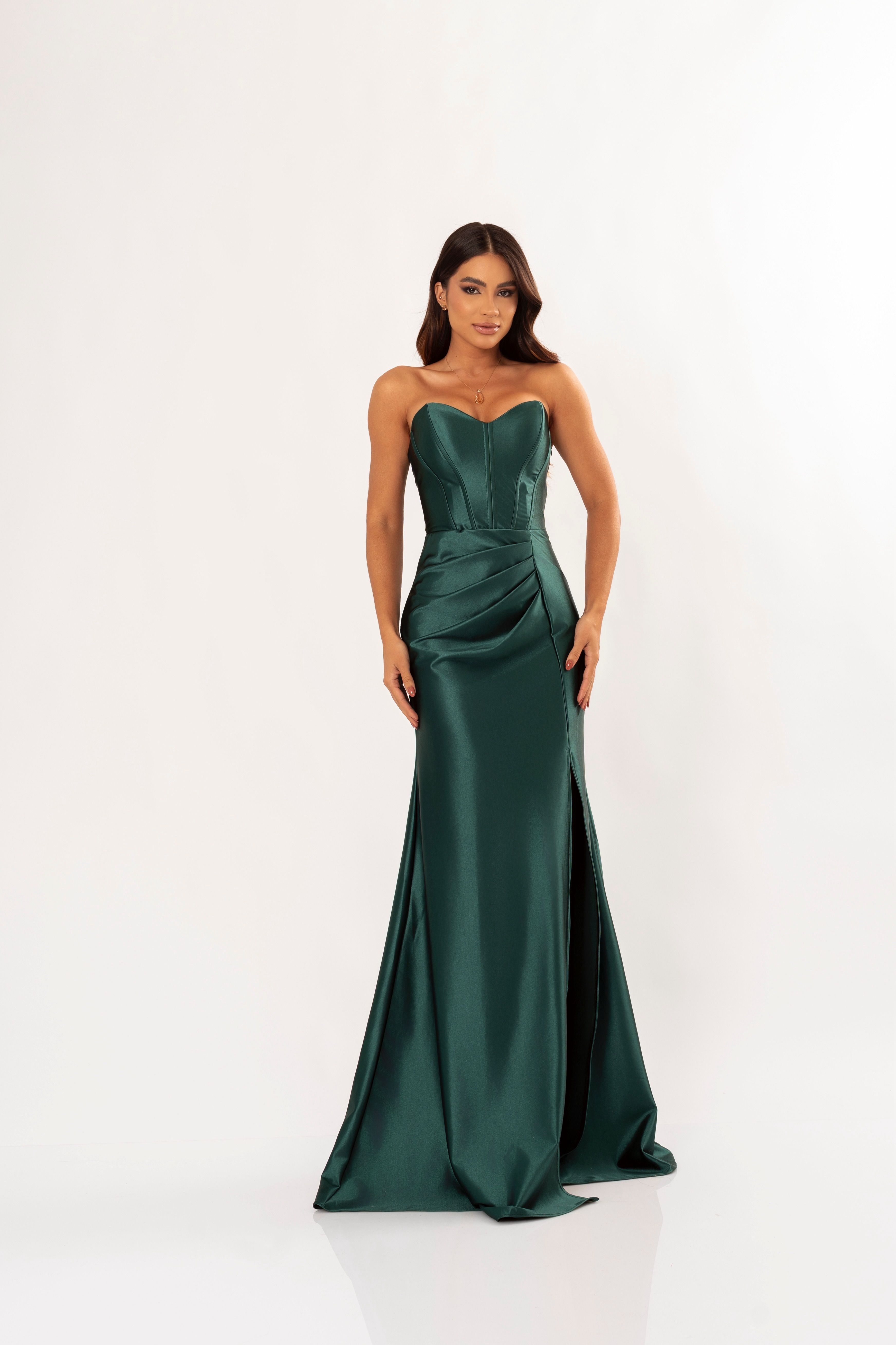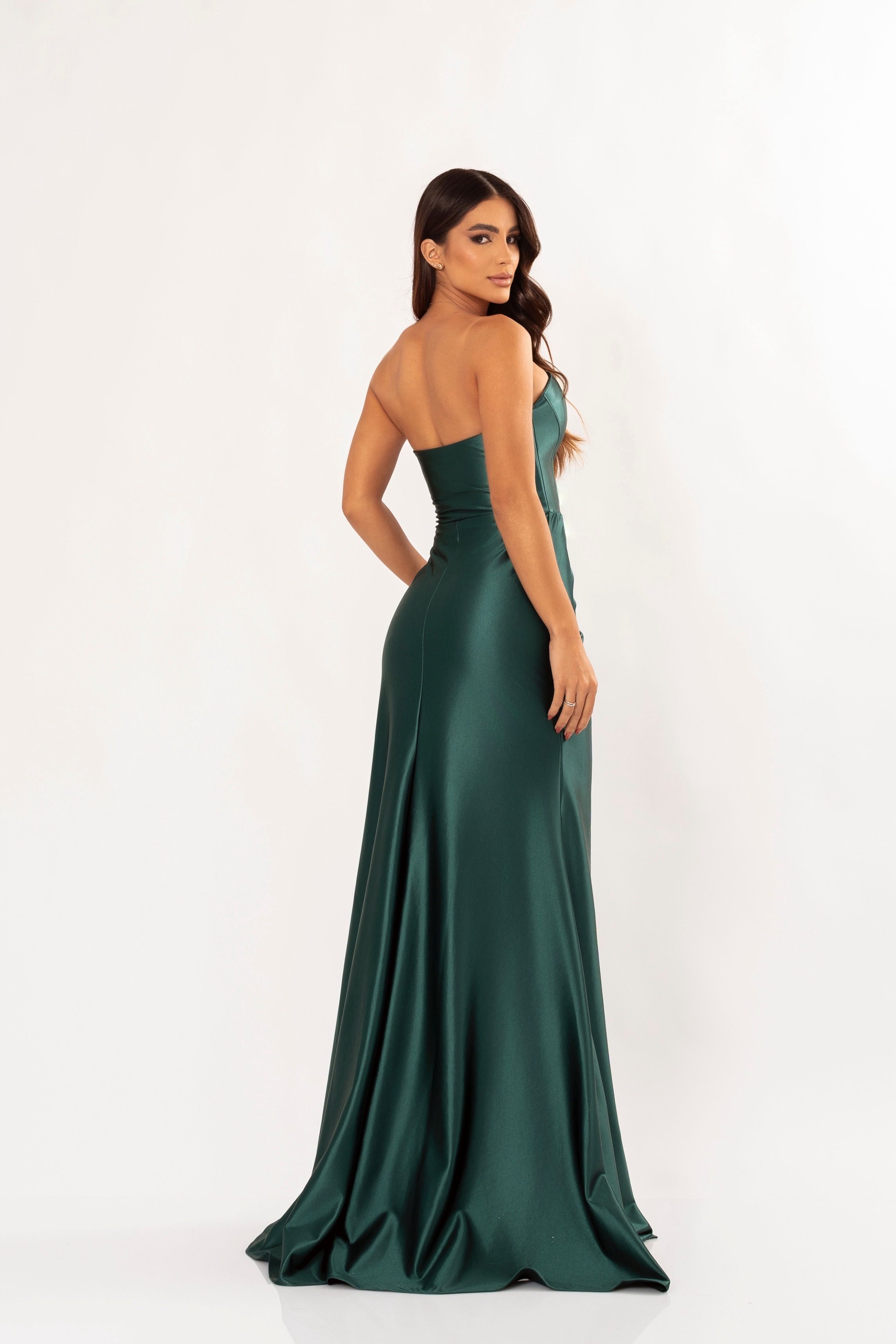 Vestido Joy — modelo tomara que caia com corset estruturado e fenda frontal. Ajustado ao corpo e confeccionado em tecido acetinado, une elegância e sensualidade. Ideal para formaturas, casamentos e eventos noturnos.