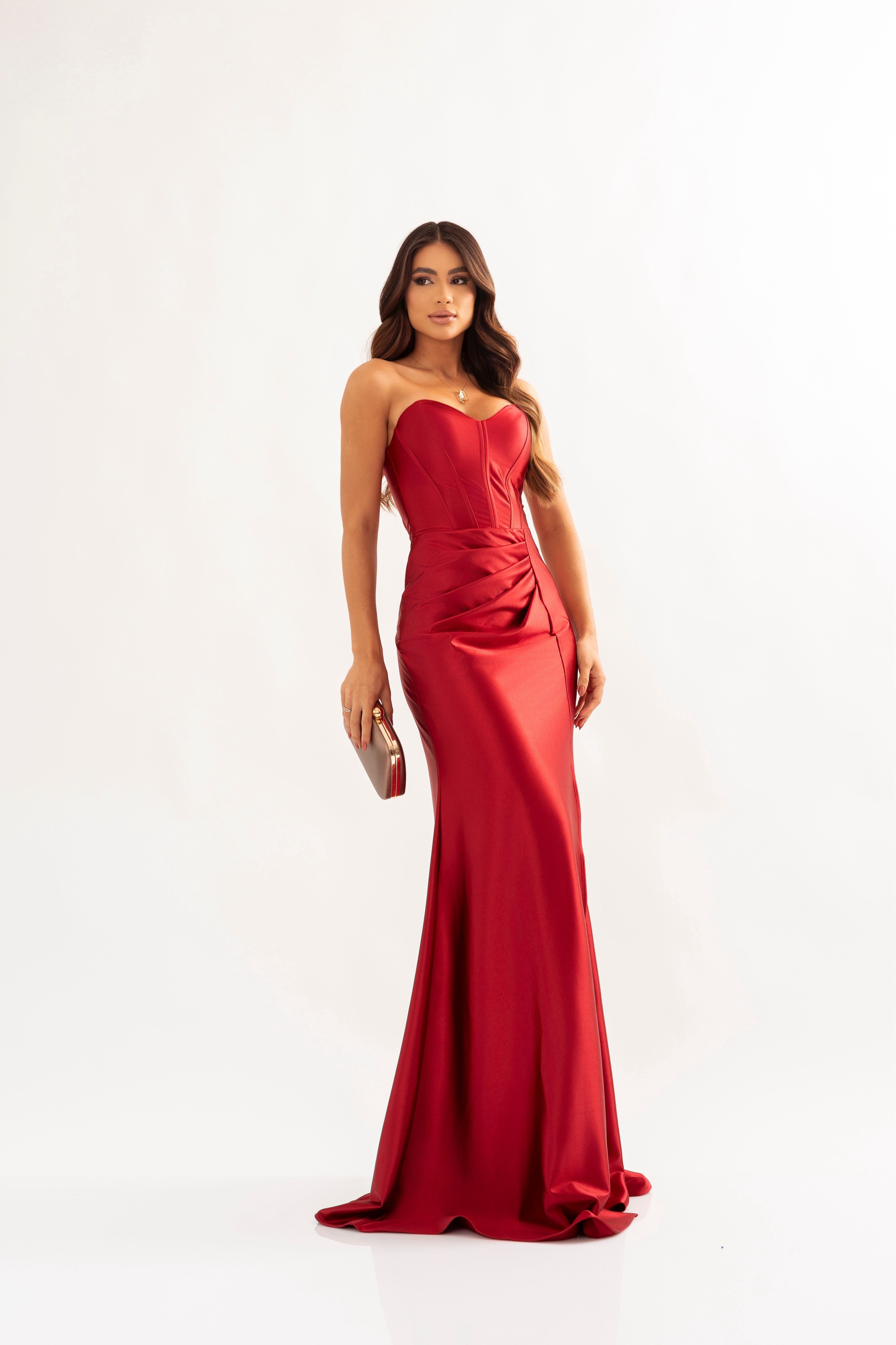 Vestido Joy — modelo tomara que caia com corset estruturado e fenda frontal. Ajustado ao corpo e confeccionado em tecido acetinado, une elegância e sensualidade. Ideal para formaturas, casamentos e eventos noturnos.