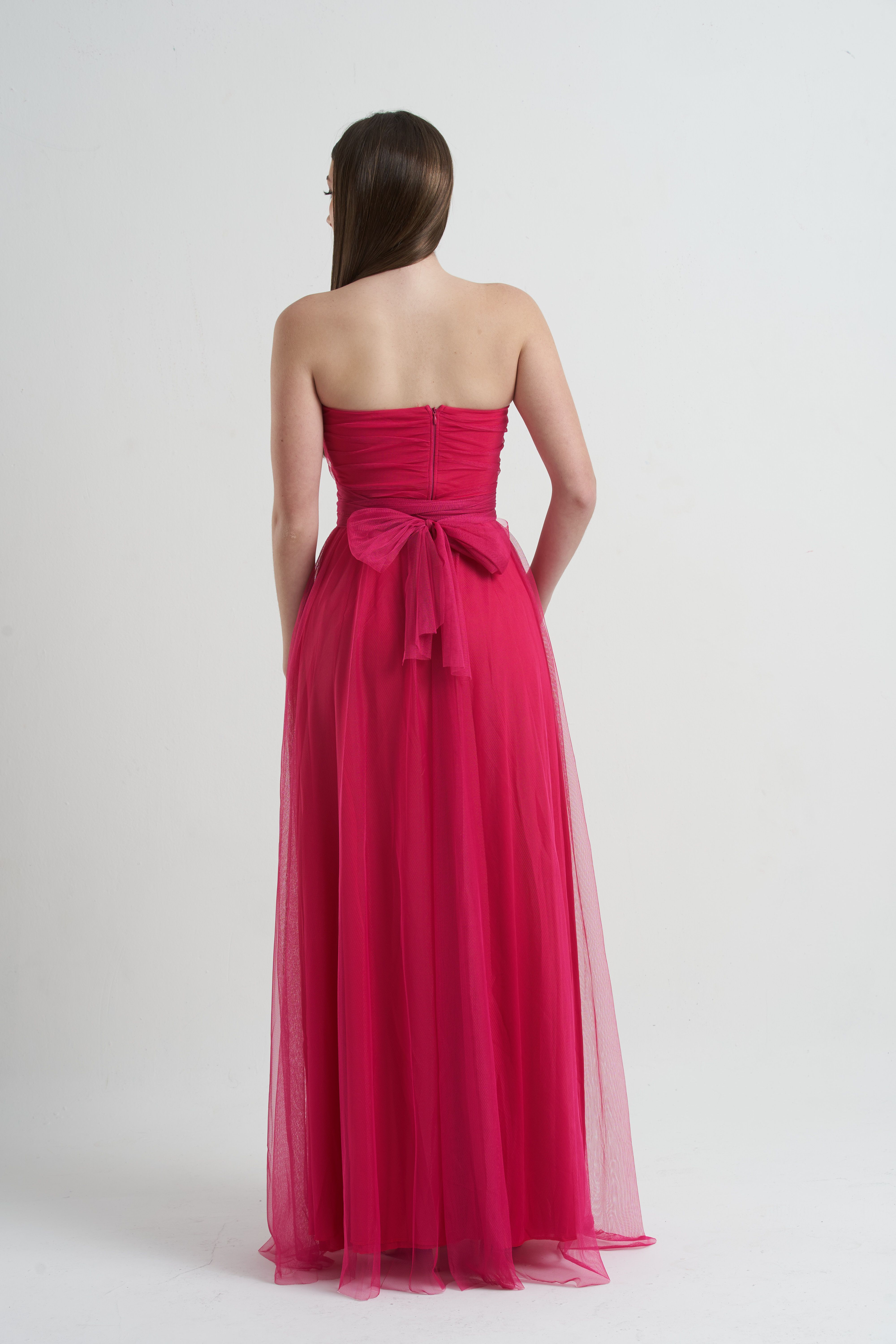 Vestido Laço Tule — modelo tomara que caia com camadas em tule leve. Romântico e delicado, perfeito para eventos diurnos e celebrações ao ar livre.
