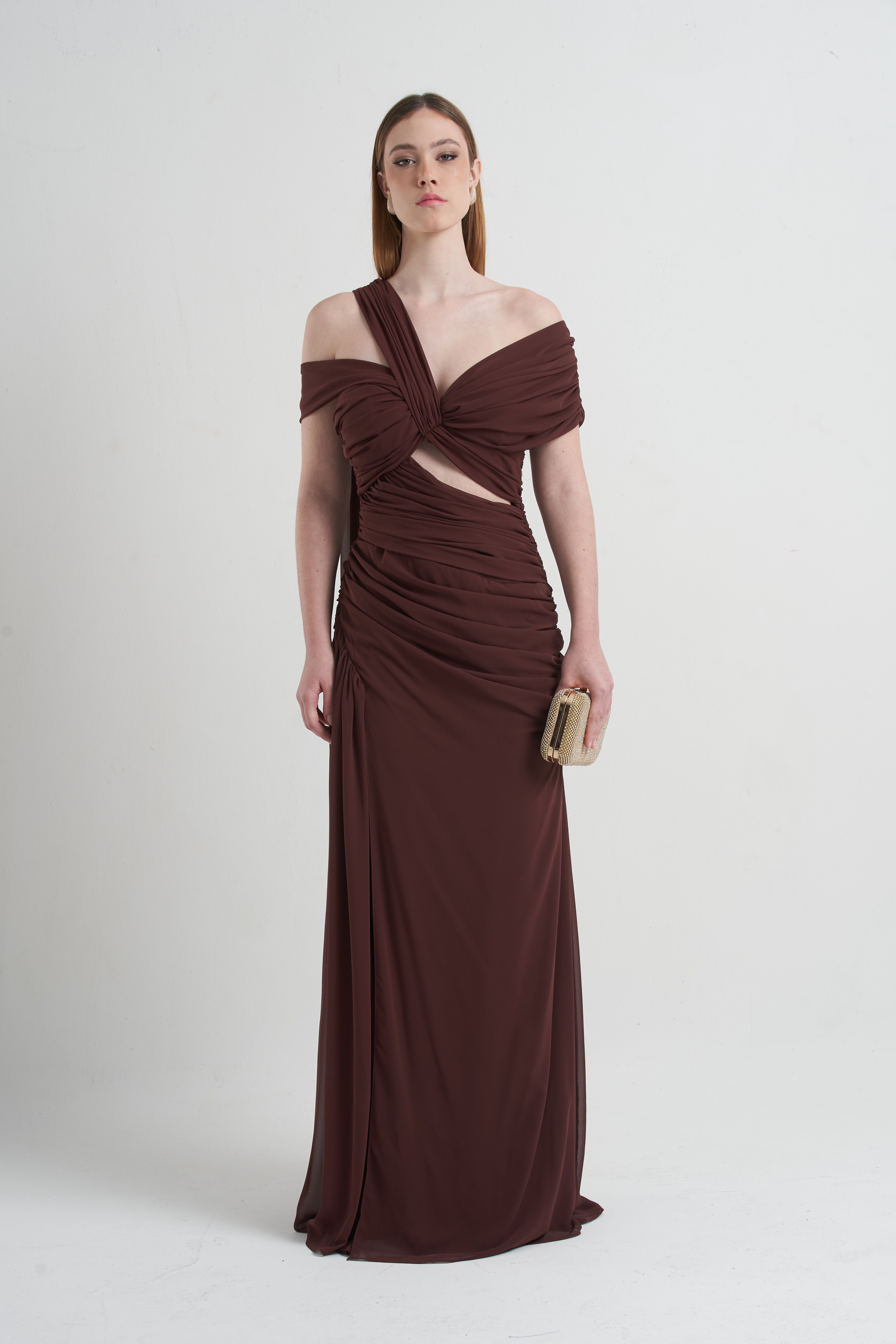 Vestido Lucy — modelo assimétrico com um ombro só e recorte lateral sutil. Sofisticado e moderno, realça a silhueta e é ideal para eventos noturnos elegantes.