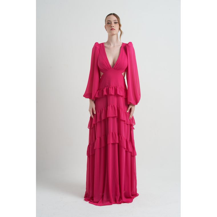 Vestido Marcelle é sinônimo de sofisticação moderna. Confeccionado em crepe leve e fluido, o modelo apresenta decote em V profundo que valoriza o colo, com bojo interno que oferece sustentação e conforto. As mangas longas levemente bufantes acrescentam elegância, enquanto a cintura marcada é equilibrada pela saia em camadas no estilo Três Marias, garantindo movimento e imponência. O recorte lateral e o decote nas costas adicionam sensualidade na medida certa. O fechamento em zíper invisível completa a peça com acabamento impecável.