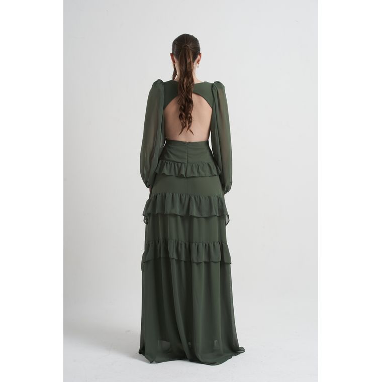 Vestido Marcelle é sinônimo de sofisticação moderna. Confeccionado em crepe leve e fluido, o modelo apresenta decote em V profundo que valoriza o colo, com bojo interno que oferece sustentação e conforto. As mangas longas levemente bufantes acrescentam elegância, enquanto a cintura marcada é equilibrada pela saia em camadas no estilo Três Marias, garantindo movimento e imponência. O recorte lateral e o decote nas costas adicionam sensualidade na medida certa. O fechamento em zíper invisível completa a peça com acabamento impecável.