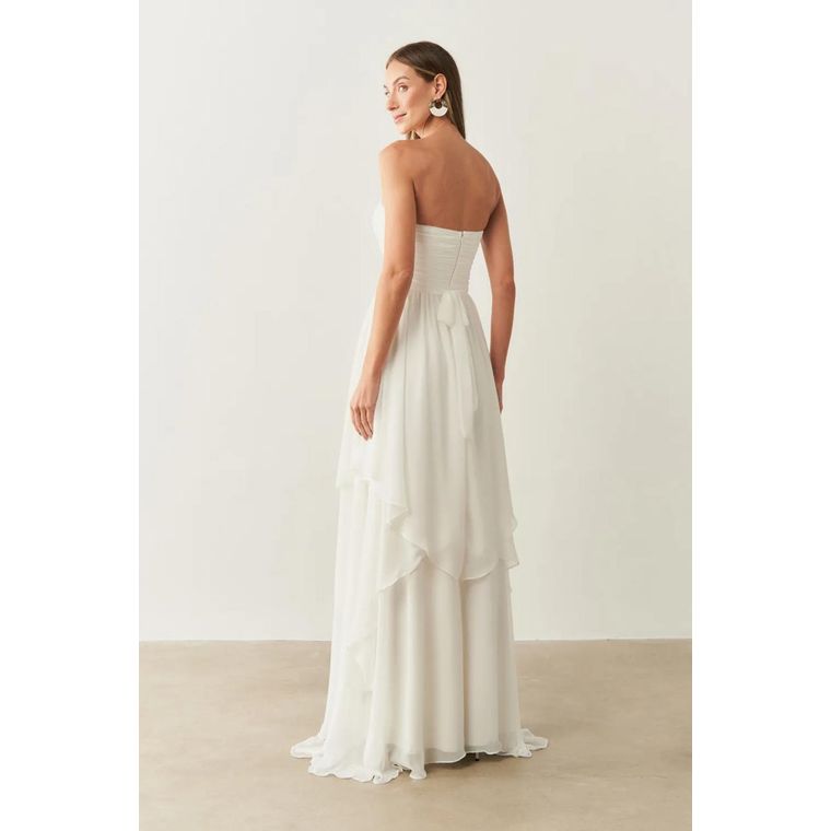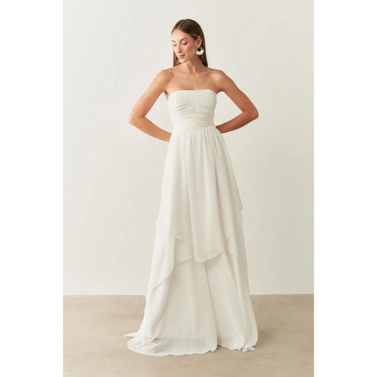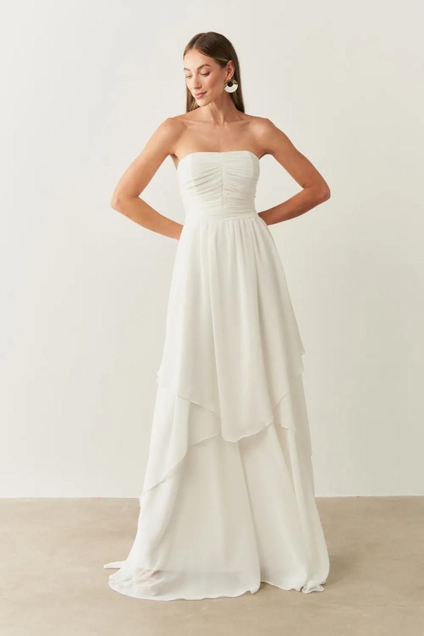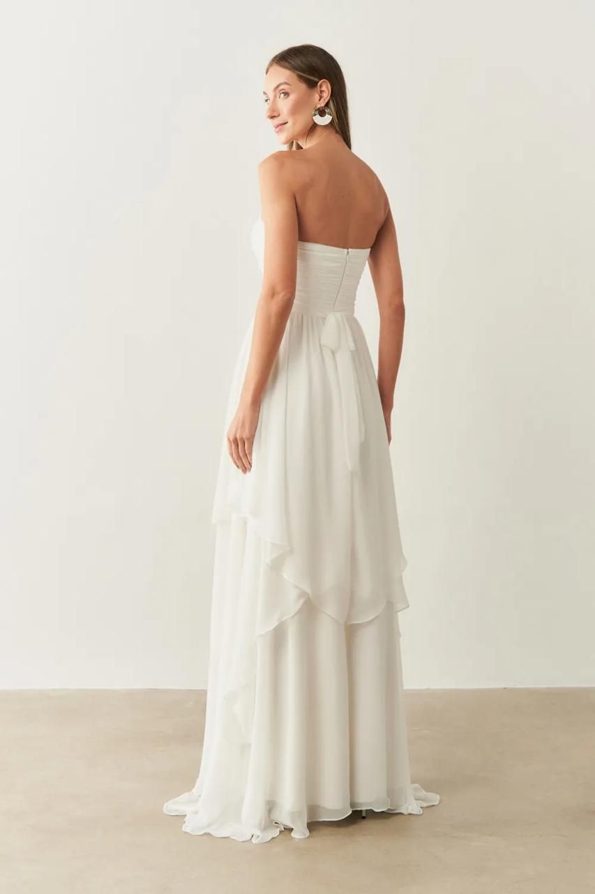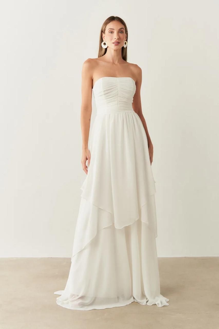 O Vestido Longo Noruega é a escolha perfeita para quem busca elegância versátil. Confeccionado em crepe, tem caimento impecável e confortável. Seu modelo tomara que caia valoriza o colo de forma sofisticada, mas conta também com alça removível, oferecendo duas opções de uso em um único vestido. A saia em camadas garante movimento e um visual moderno e romântico ao mesmo tempo.