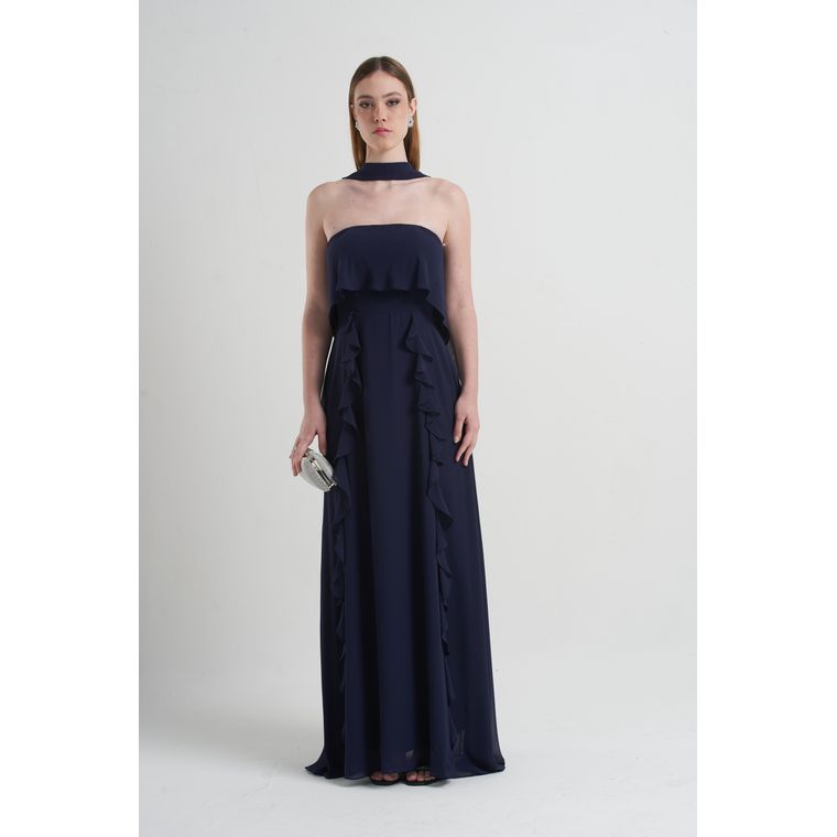 Vestido Ravena é a escolha certa para quem busca sofisticação atemporal com um toque moderno. Confeccionado em tecido leve e refinado, o modelo tomara que caia valoriza o colo e os ombros, enquanto a faixa de transparência no busto adiciona sensualidade sutil. A saia longa fluida, com babados verticais, proporciona movimento elegante e alonga a silhueta, tornando o visual imponente e marcante para ocasiões especiais.