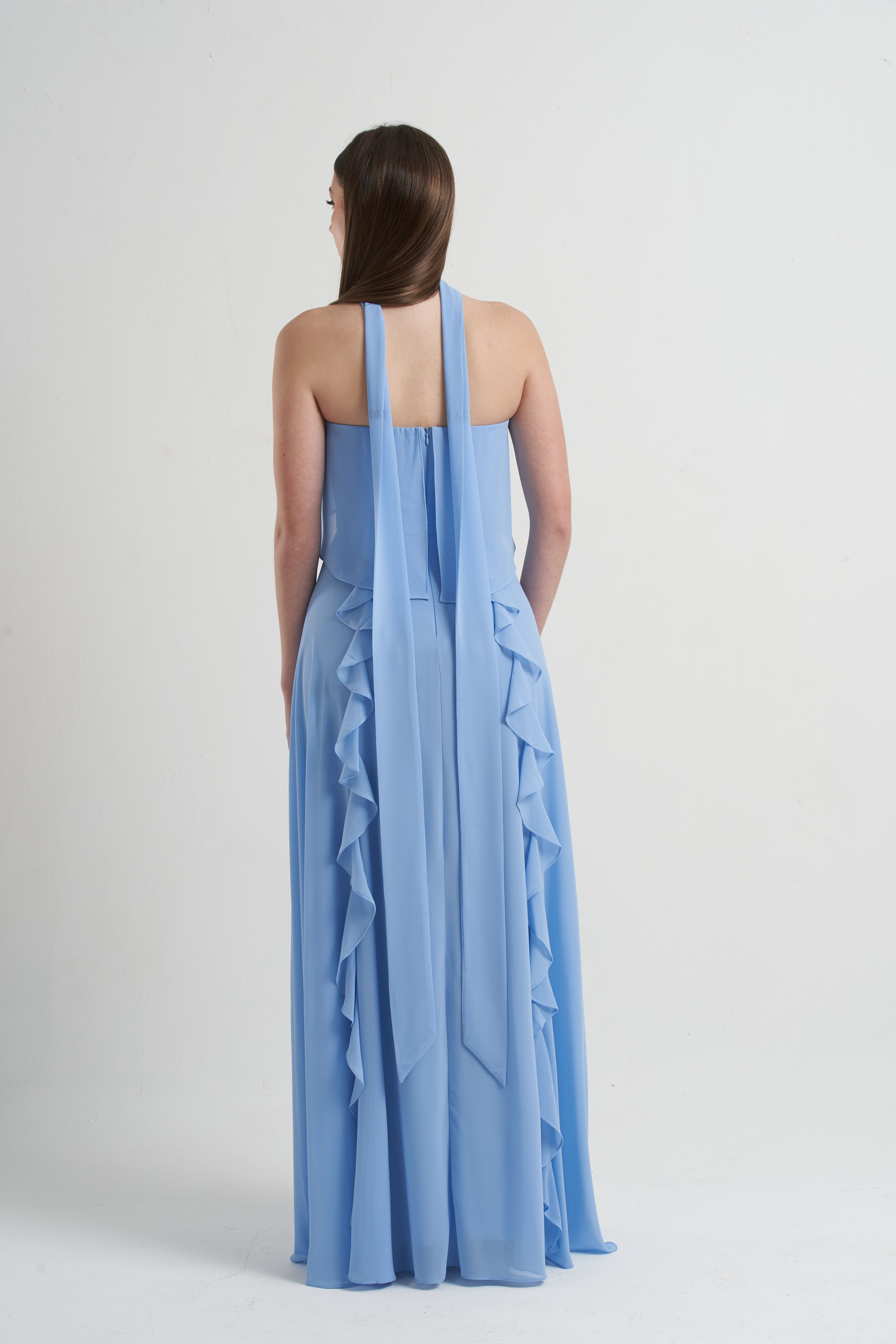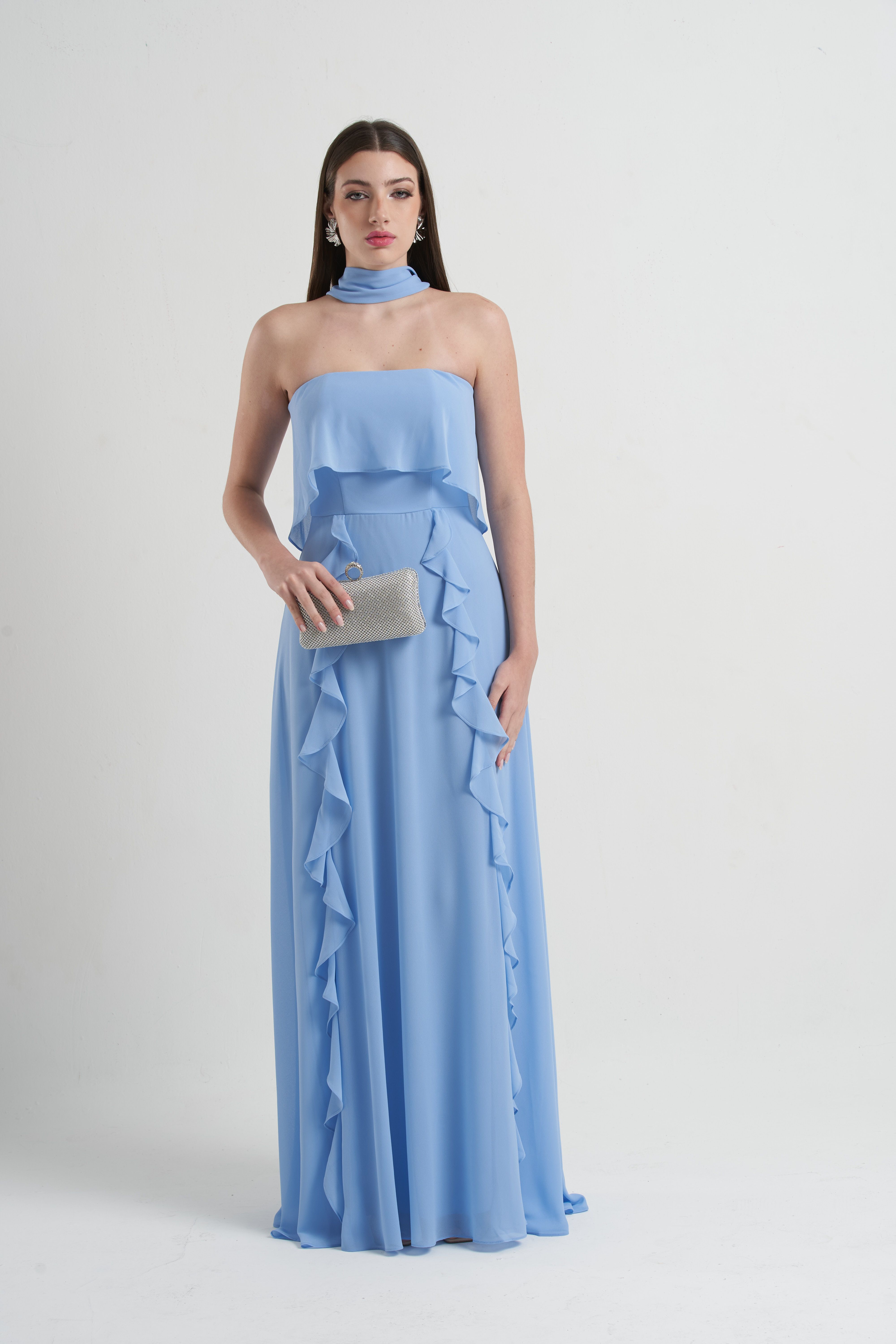 Vestido Ravena — em azul serenity, modelo tomara que caia com babados verticais delicados. Elegante e moderno, ideal para eventos sofisticados e ocasiões especiais.