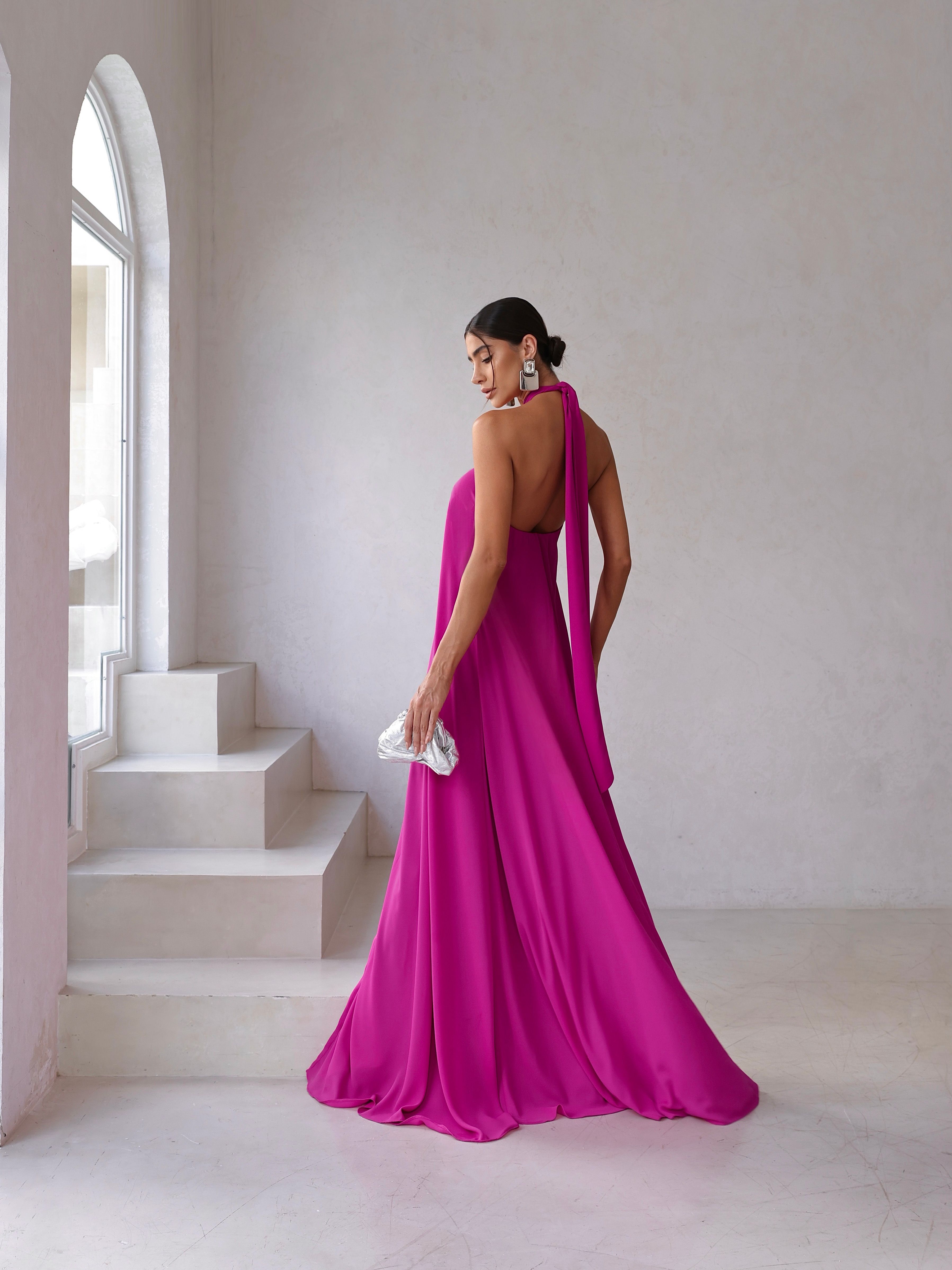 é a escolha perfeita para quem busca leveza e movimento, ideal como opção de vestido para casamento na praia. Com modelagem fluida e acabamento sofisticado, ele é confeccionado em chiffon leve, que proporciona um caimento elegante e confortável.