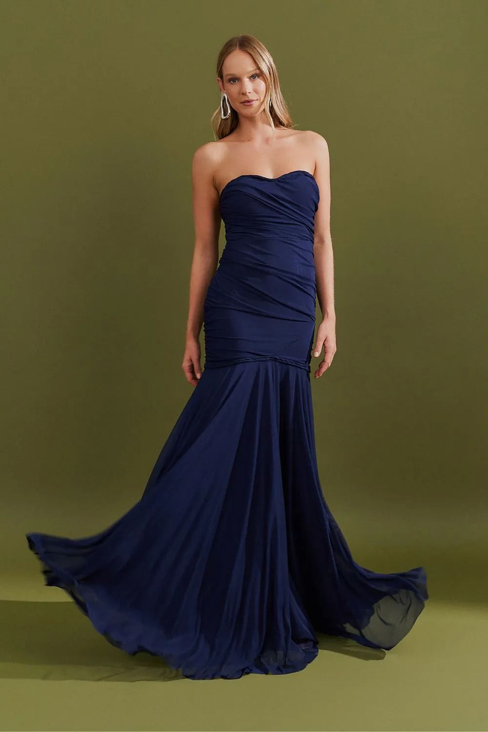 Vestido Veneto — modelo tomara que caia com caimento ajustado e saia fluida em tule. Elegante e feminino, ideal para festas, casamentos e eventos noturnos.